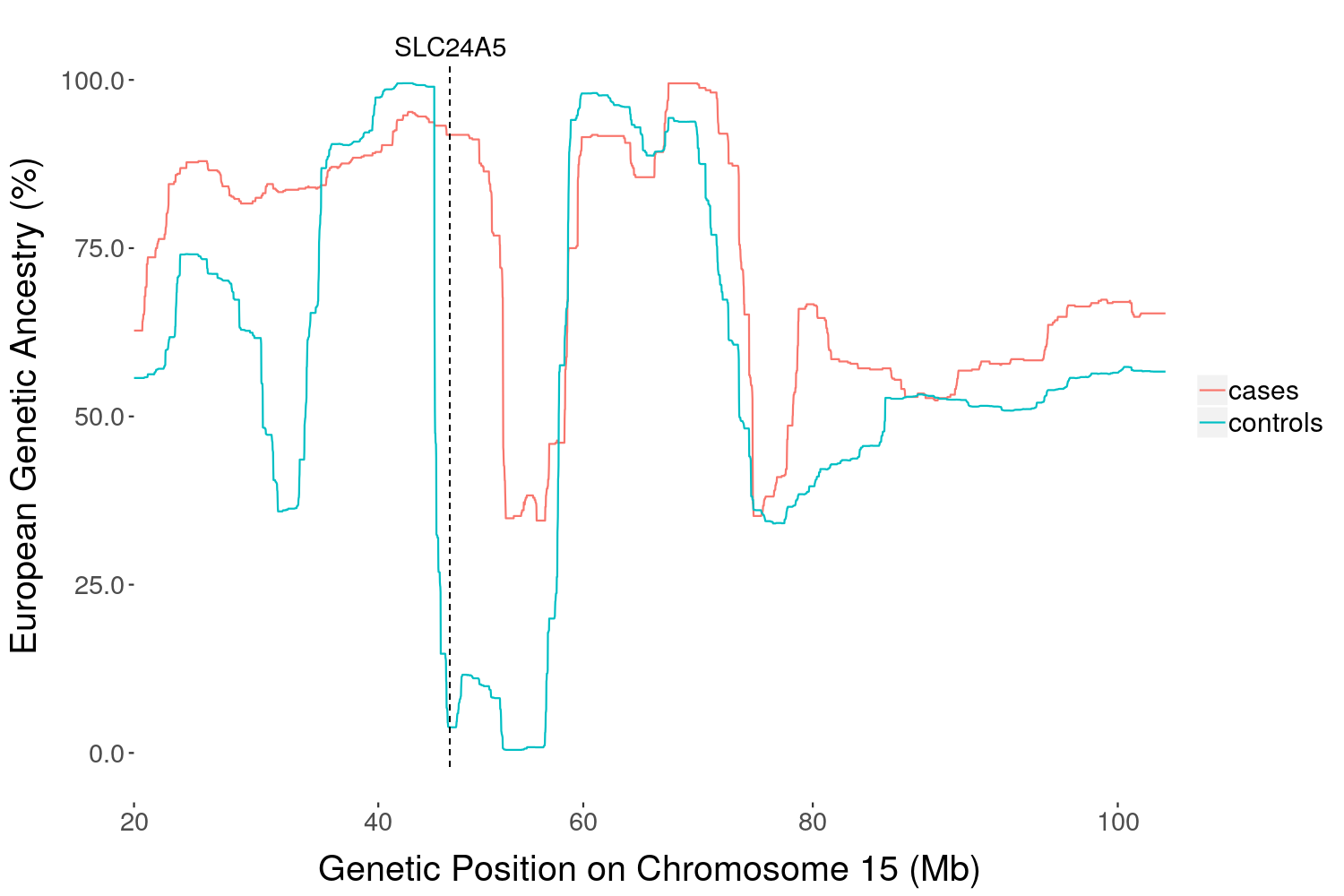 We found that Northwestern European genetic ancestry is associated with increased risk of cSCC in non-Hispanic whites, and more so in Hispanic/Latinos of the US. The ancestry effects are largely, but not entirely explained by genetic determinants of skin pigmentation in both populations. Moreover, the ancestry effects were attenuated but not eliminated after adjusting for a clinical marker of chronic sun exposure. We also found evidence that the percentage of European ancestry at the SLC24A5 locus was strongly correlated with cSCC case status in Hispanic/Latinos (Figure 2). Interestingly, we also reported an association of the well-known pigment variant that leads to an amino acid substitution (Ala111Thr) at SLC24A5 with cSCC risk in Hispanic/Latinos. The Thr variant is fixed in Europeans while the Ala variant is fixed in Native Americans and East Asians, and hence the two variants are polymorphic in Hispanic/Latinos who have Native American and European admixture. This association of SLC24A5 skin-pigment associated variant with cSCC in Hispanic/Latinos is notable, as it has not been previously reported for cSCC, and likely explains the local ancestry effect. Further, SLC24A5 variant has a large effect on cSCC risk (OR=2.54 for Ala heterozygotes and 6.45 for Ala homozyogtes) and can explain a substantial proportion of the cSCC risk in Hispanic/Latinos.