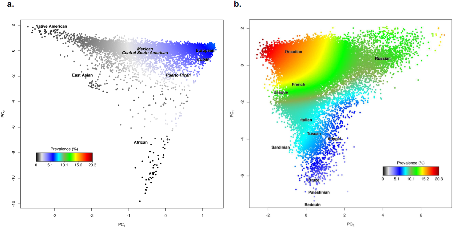 Figure 1. Ancestry contour figure showing cSCC prevalence by genetic ancestry in GERA. a. Hispanic/Latinos (N=8,490 individuals, including 294 cSCC cases); b. non-Hispanic whites (N=78,583 individuals, including 11,028 cSCC cases). cSCC prevalence is indicated on a color scale, with red hues indicating higher prevalence. Axes reflect the first two principal components of ancestry. Nationality subgroup labels were derived from the Human Genome Diversity Project.