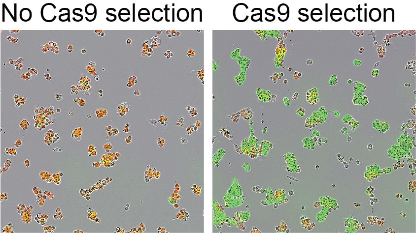 Despite being initially disheartened, we realised that Cas9 could be used in a novel manner for selection of recombinant vaccinia viruses. When using traditional homologous recombination to edit vaccinia virus genomes, edited viruses are often difficult to detect due to their low frequency. However, by designing a Cas9/guide RNA complex that is complementary only to unedited virus genomes, we "kill" off parent viruses and drive selection of the desired recombinants. This can be seen via microscopy, where the Venus+ (green) minority are selected from a background of mCherry+ (red) viruses, using an mCherry-specific Cas9/guide RNA complex (Figure 2). Note that in the absence of selection, mCherry+ viruses dominate. To see this in live cells - watch our supplemental video.