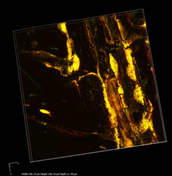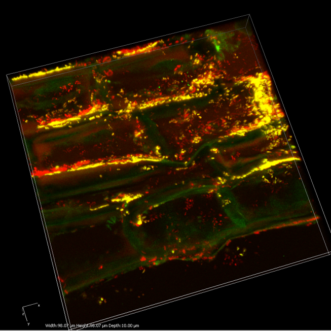 "The yellow bits are all the clam symbionts (Candidatus Thiodiazotropha) sitting directly on seagrass roots (seen in green) - they especially like the grooves in between the plant cells. The red bits are some other kinds of bacteria not related to the symbionts"