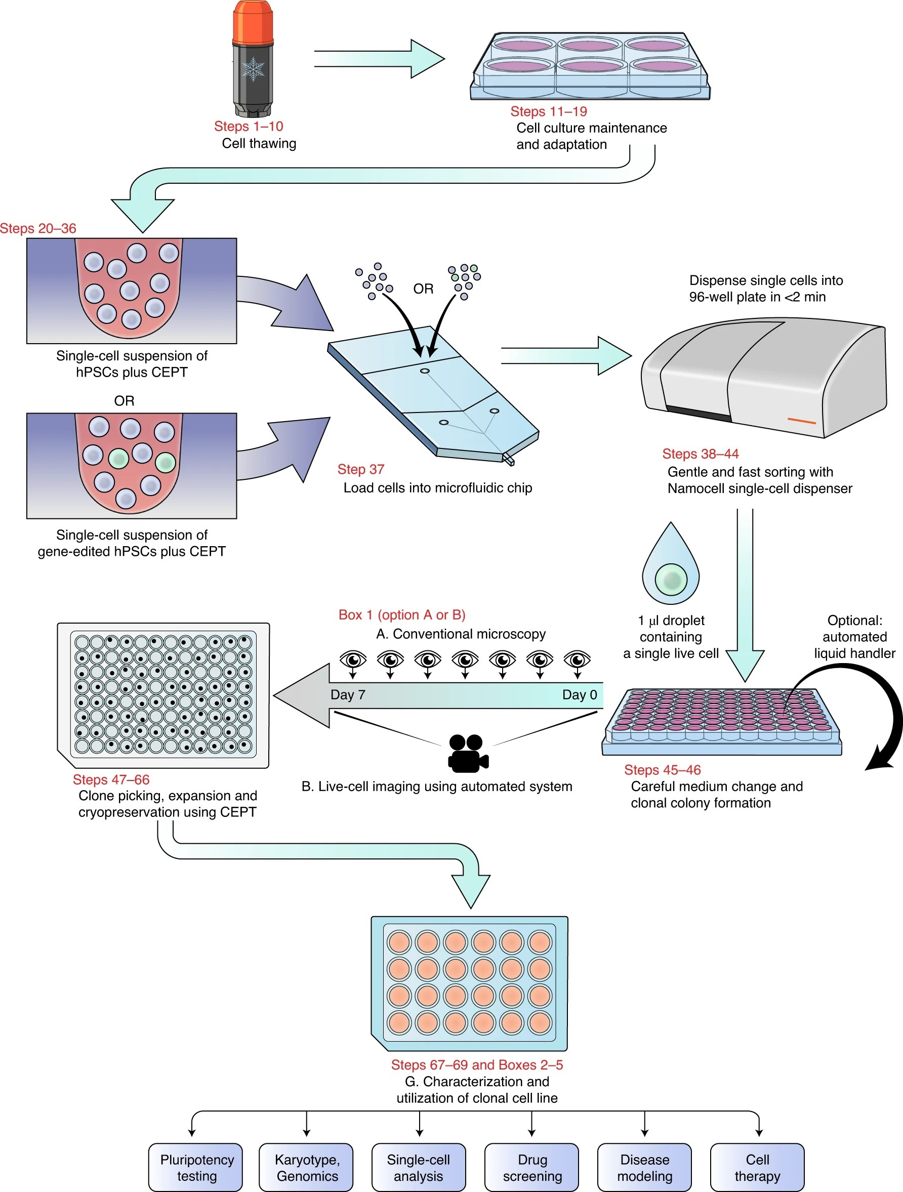 Briefly, hiPSCs are routinely cultured in feeder-free chemically defined E8 medium using the CEPT cocktail for 24 hours at every passage. The cytoprotective effects of CEPT ensure high cell quality and optimal growth conditions of genetically stable cell lines. To demonstrate the advantages of CEPT for single cell cloning, we performed various comparisons with Y-27632, CloneR, and different cell sorting methods including FACS-based cell sorting system (FACSAria III from BD Biosciences) and image-based single cell printing (Cytena SCP from Molecular Devices), and microfluidic cell dispensing (Hana from Namocell). CEPT proved to be the most efficient in all cases. For instance, single cell cloning efficiencies with CEPT were improved 6-fold when compared to Y-27632 and 1.5-fold when compared to CloneR. Notably, these studies established that CEPT in combination with fast, gentle, and microfluidic cell dispensing was particularly user-friendly.