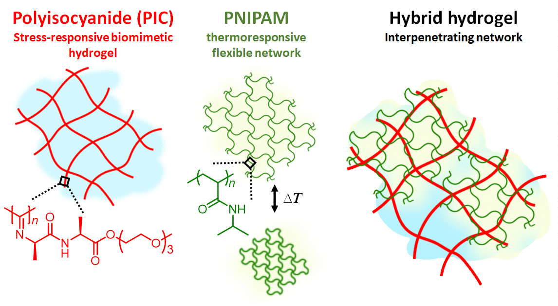 Figure 1 | Hydrogel composite made of the semi-flexible and strain-stiffening PIC (red) and the thermosensitive PNIPAM (red) giving stiffening interpenetrating hybrid gels. As the temperature reaches 33 °C, the PNIPAM collapses and strains the PIC gel that becomes much stiffer. The response is fast and reversible.