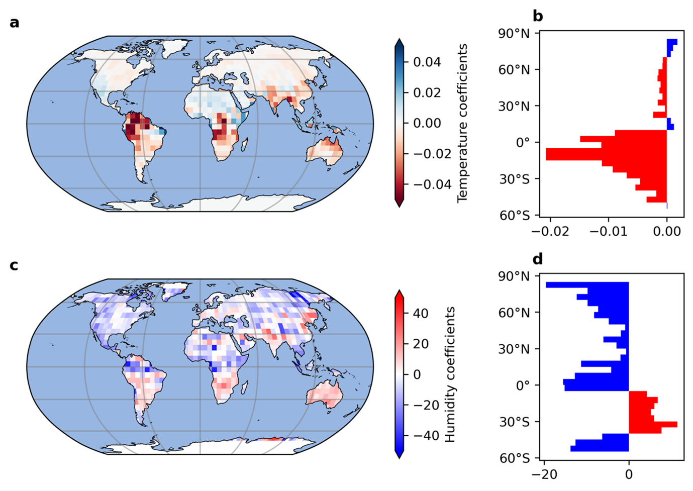 The temperature fingerprint reveals the dominance of large negative regression coefficients over the tropical lands, suggesting a stronger signal of the annual global average of terrestrial water storage (AGTWS) change in these regions embedded daily temperature fluctuation compared to westerlies dominated regions. On the other hand, the spatial patterns of humidity fingerprint show more evenly distributed magnitudes compared to the temperature fingerprint, indicating a more homogeneous distribution (Figure 2). Negative coefficients are observed over most of the land areas in the Northern Hemisphere and along the Equator. The results also show a broad congruency between the two sets of AGTWS estimates over different intervals, especially from the early 1960s onwards when decreasing trends are perceptible in both models (Figure 3a) and the average of reanalyses (Figure 3b).
