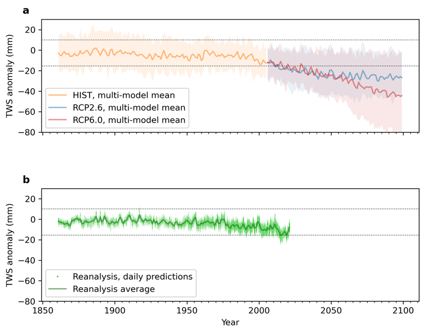 A recent study, building upon the “fingerprints” – the conception of human effects on climate that is based on detection and attribution techniques – was conducted to identify the relationship between annual global mean TWS and the daily surface air temperature and humidity fields using multi-model hydrological simulations. The study followed a previously established machine learning approach that makes use of statistical learning techniques[6], but extended the focus to extract externally forced “fingerprints” from global weather patterns of daily surface air temperature and specific humidity.