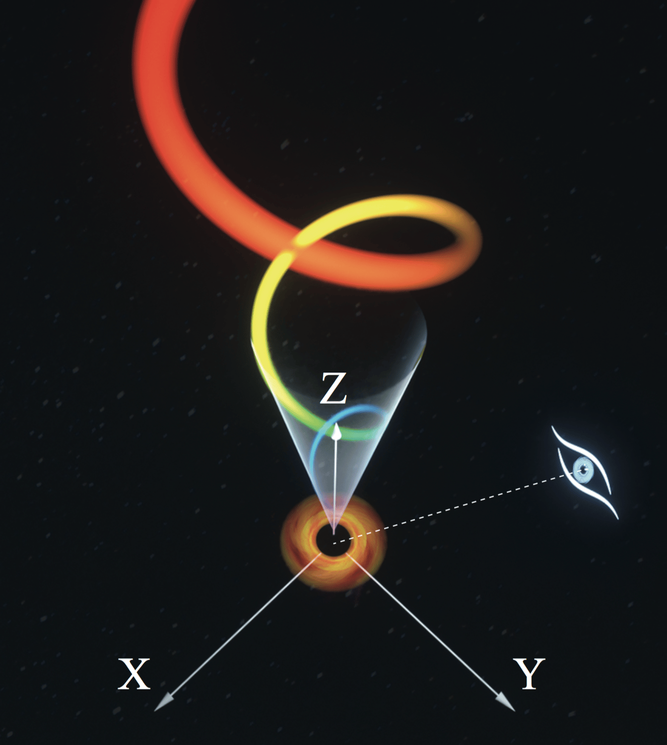 The following story confirmed our expectation. We detected a low-frequency QPO above 100 keV in the black hole MAXI J1535-571 in 2017. This time, the detection energy is extended to above 200 keV! It is the highest energy low-frequency QPO ever found! The big news spread through the Insight-HXMT research group quickly. But when we calm down from the excitement, what we meet is how to explain the origin of the high-energy low-frequency QPO. Obviously, it can not come from the thermal radiation region of the accretion disk, as the energy is too high. Moreover, the frequency and variability amplitude of the QPO are nearly constant in different energy bands, and the high-energy QPO precedes the low-energy one with a maximum time difference of 0.9s. Thus, the oscillation or precession of the coronal X-ray emitting region would face considerable challenges to explain the QPO. Finally, all evidence points to the fact that the QPO comes from the precession of a jet, and the jet is near the black hole’s event horizon. When a black hole drags the surrounding space-time, the jet would precess around it, like a dancer dancing around a pillar. The QPO above 200 keV is from the relativistic jet closest to the black hole, while the low energy one is produced at a part of the jet far away from the black hole.
