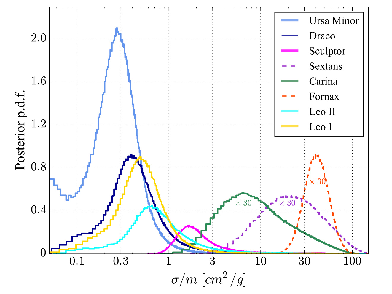 Figure 3 The self-interaction cross section of dark matter particles extracted from the Monte Carlo Markov Chain analysis carried out in our study. This result is intimately connected with the observed stellar kinematics of the 8 Milky Way dSphs and the cosmological prior on the concentration-mass relation extracted from this CDM simulation.