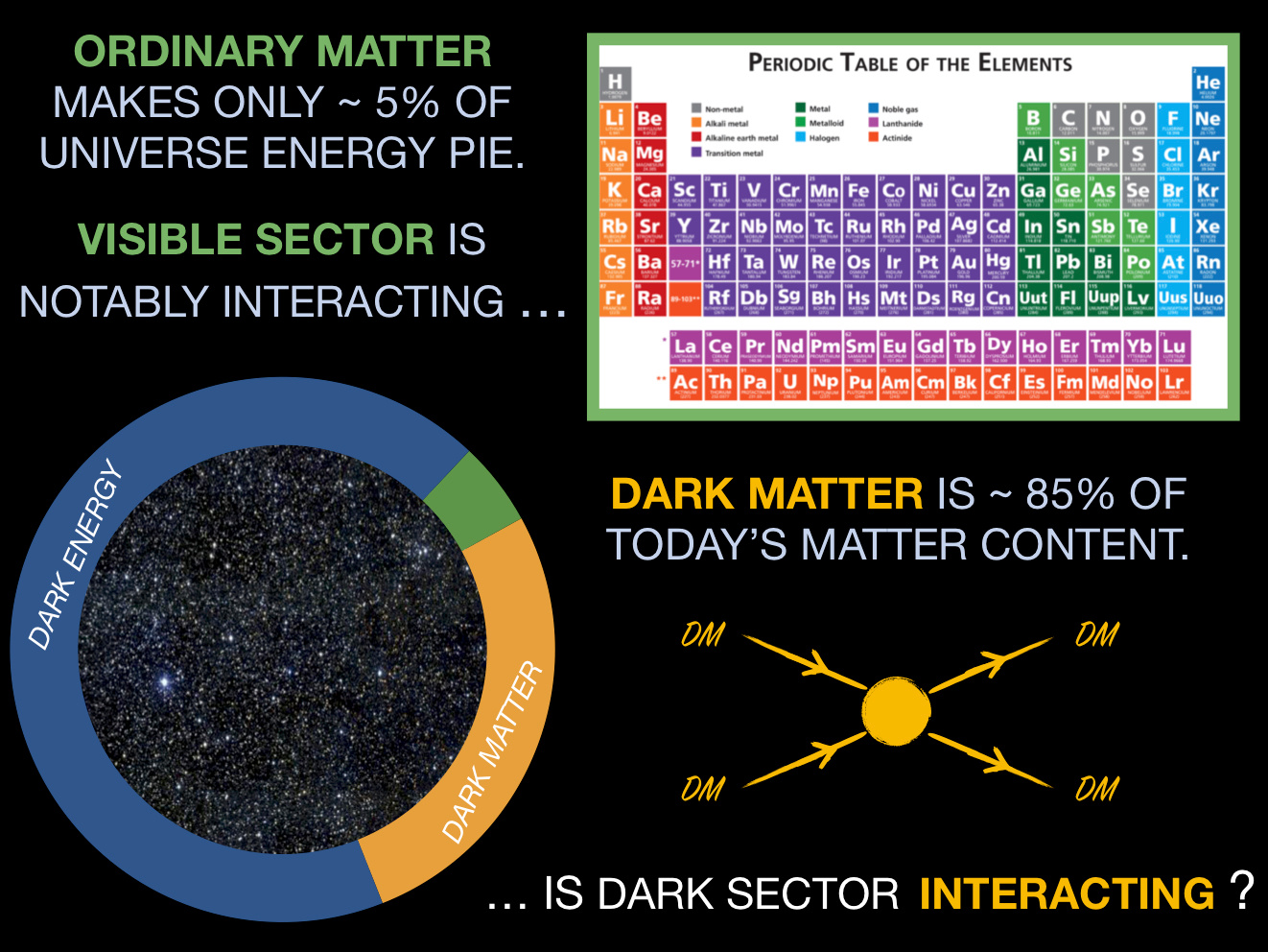 Figure 1 A schematic picture of the dark matter problem and the related interesting question we try to answer in this work, analyzing the stellar kinematics in the dwarf spheroidal galaxies of the Milky Way: Do dark matter particles interact with each other? Is there any evidence of this property in the galactic halo of dark matter dominated objects such as dwarf spheroidals?