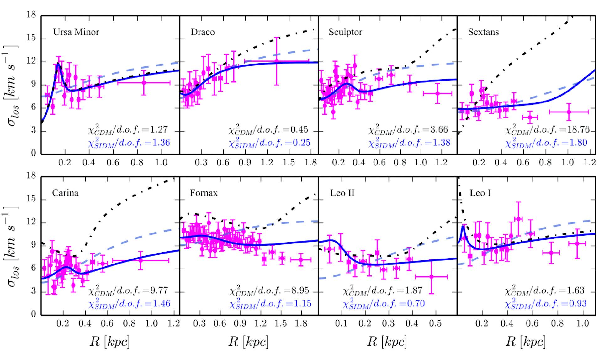 Figure 2 These are the fits to line-of-sight stellar kinematics we obtained for each of the 8 classic satellites of the Milky Way. Dot-dashed black lines represent the outcome obtained within CDM, exploiting the concentration-mass relation from corresponding N-body simulations. Blue lines are obtained promoting the dark matter paradigm to the case of SIDM. The thick blue lines, in particular, exploit a general stellar anisotropy modeling, that contrary to the CDM case, allows us to accomodate well data within the SIDM picture.