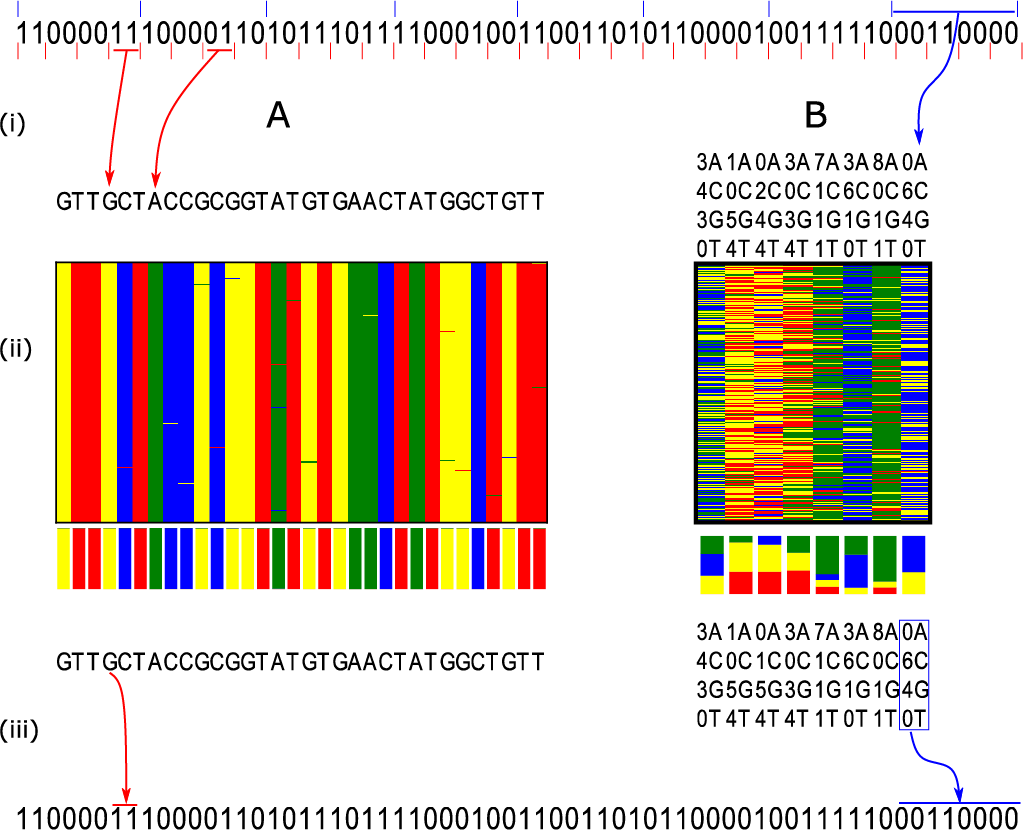 B) The same message is encoded using a composite DNA alphabet by mapping every 8 bits (represented by the blue separating lines) of the binary message to a single composite DNA position (a single synthesis cycle). Sufficiently deep sequencing allows correct inference of the original composite letters.