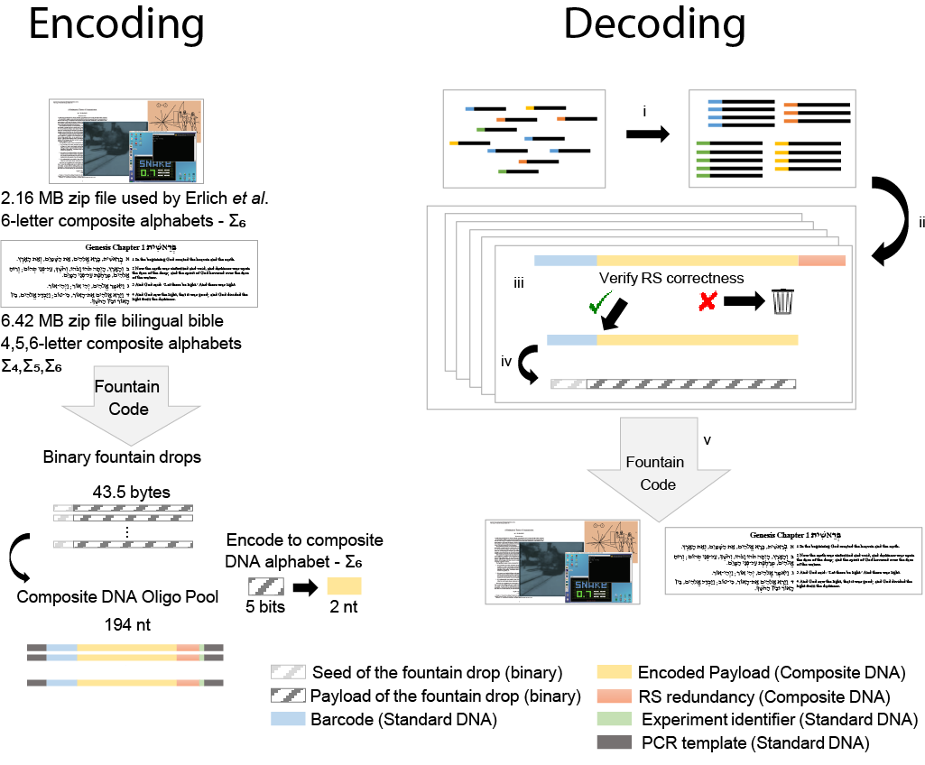 Left) Encoding: A compressed input file was processed by the fountain code to produce binary droplets. A composite DNA encoding workflow was then applied for each droplet including the translation of every 5 bits to a single composite letter (out of 6 possible letters) and the addition of Reed-Solomon error correction symbols (RS), all resulting in a composite DNA sequence. All composite DNA sequences where then synthesized by Twist Bioscience to produce a composite oligo pool and sequenced in the Technion Genome Center.