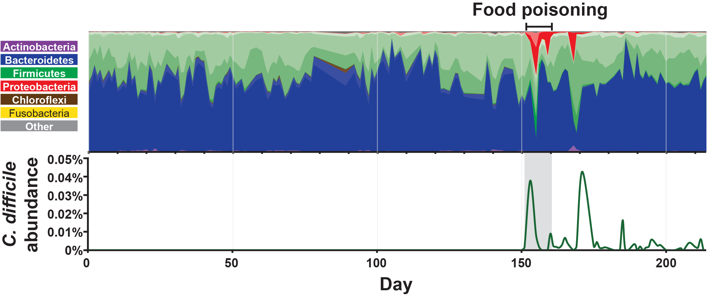 Using publicly-available microbiome sequencing data, we discovered that C. difficile colonizes people as they recover from gastrointestinal (GI) disturbances, and that carriage can persist for years at a time. Although all the data we re-analyzed each reveal different aspects of how C. difficile colonizes and spreads, there was one person whose experiences exemplified the primary observations from our study. During a long-term study that involved collecting daily fecal samples, this person became colonized by C. difficile after getting food poisoning.