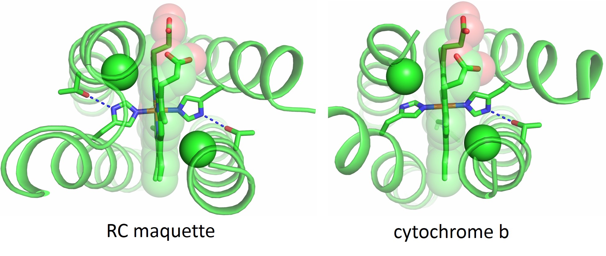 Figure 2: Crystal structures show that the electron acceptor module of the RC maquette (left, PDB ID: 5VJT) resembles cytochrome bc1 (right, PDB ID: 2A06)6 despite low sequence identity between the structures. Notch glycine Cα atoms are shown as green spheres and Thr-His hydrogen bonds are shown as blue dotted lines.