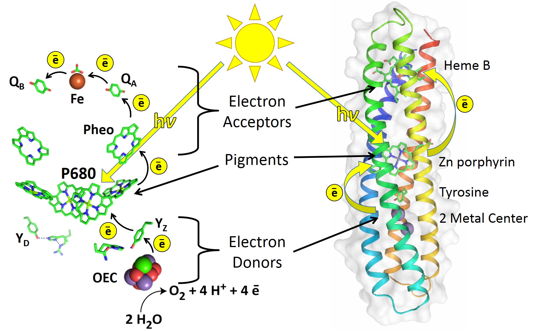 Figure 1: The RC of Photosystem II (left) uses electron donors, pigments, and electron acceptors for a series of electron transfer reactions2. Similarly, the de novo-designed RC maquette protein (right) assembles a DPA electron transport chain that uses light energy to drive photochemical charge separation.