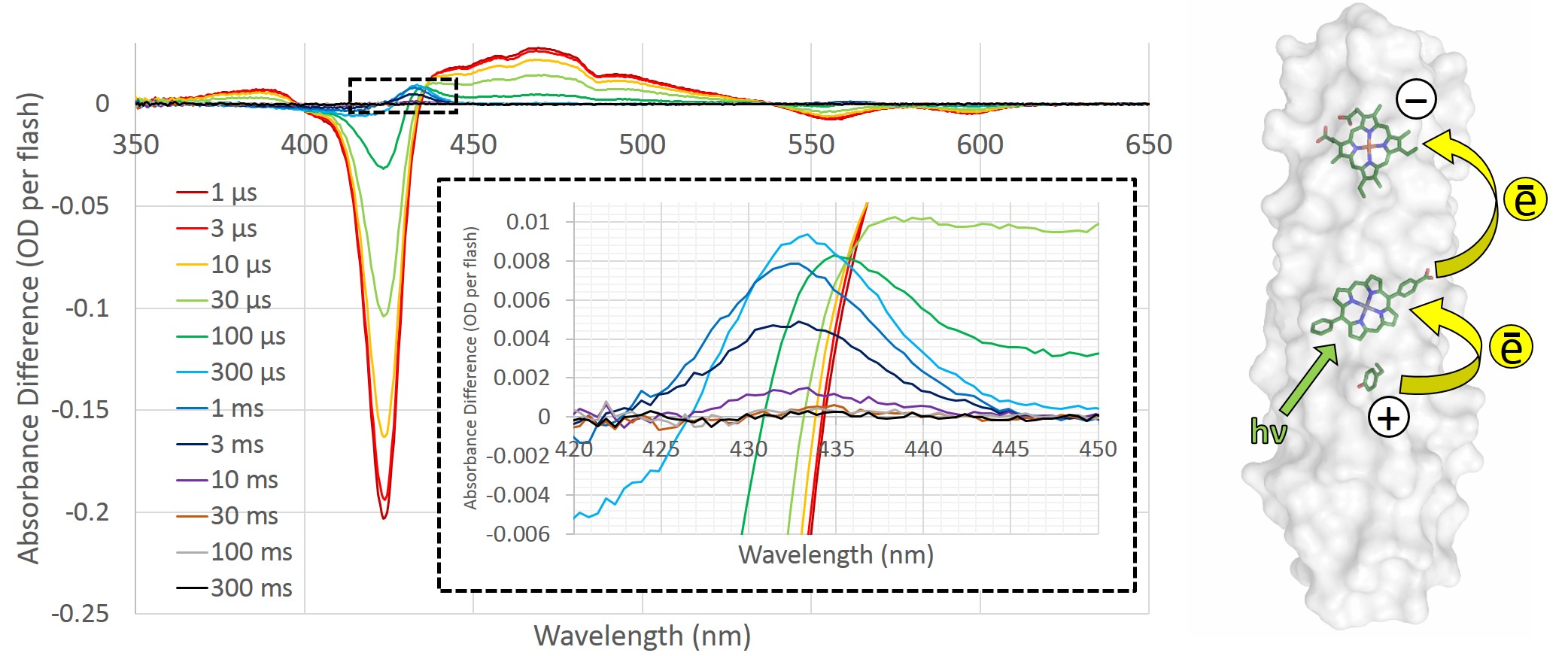 Figure 3: Transient absorption spectroscopy of the tyrosine-Zn porphyrin-heme triad. The intense Zn porphyrin Soret bleach at 422 nm indicates photoexcitation of the pigment. Inset: A close-up of the heme redox signal at 432 nm, which enables estimation of the yield and lifetime of charge separation. The presence of tyrosine168 makes the heme redox signal at 432 nm detectable for milliseconds; removal of the electron donor by mutation of tyrosine to leucine eliminates the 432 nm signal. Right: a representation of the electron-transfer triad based on crystal structures.