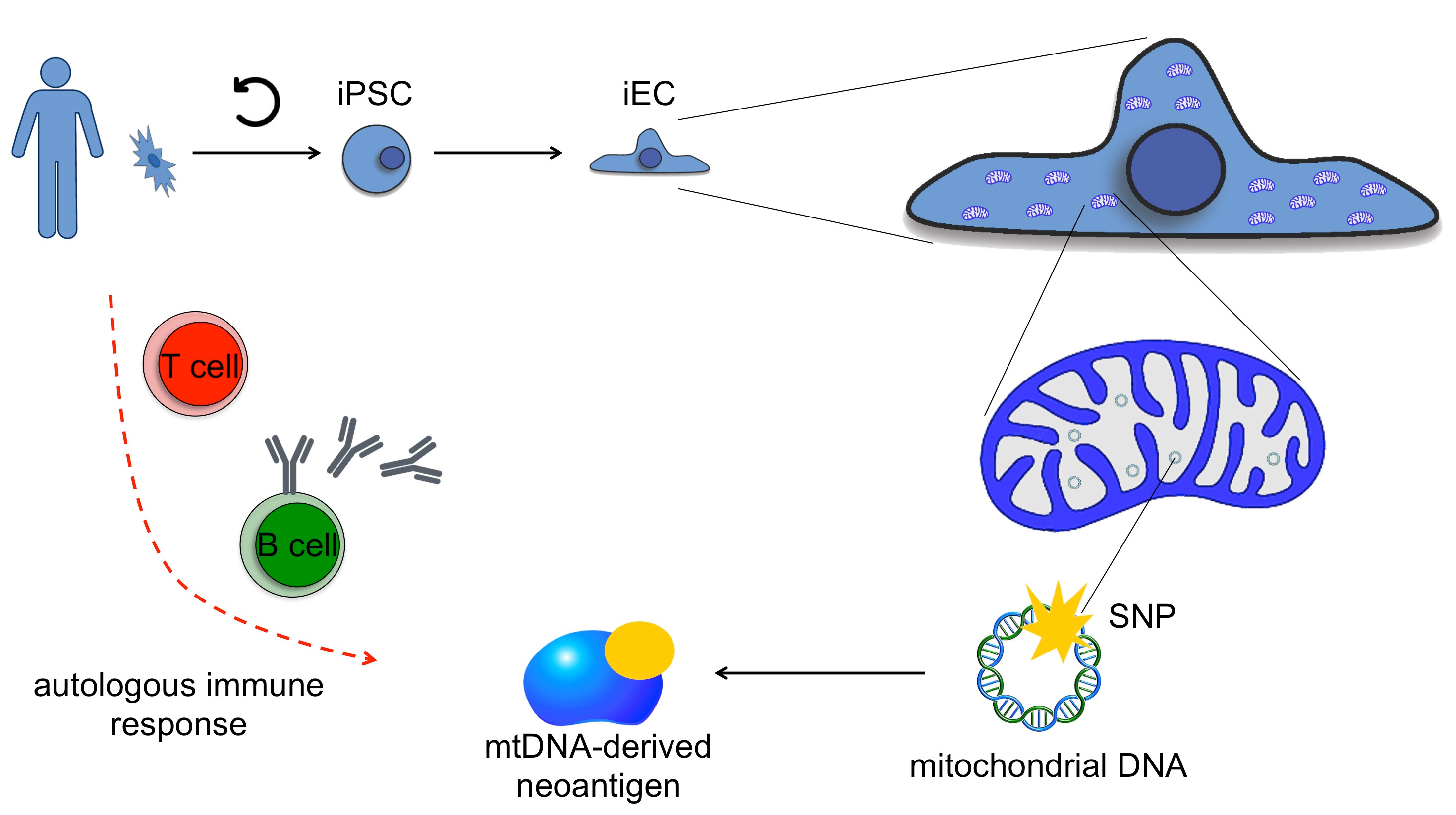 Experimentally, there have been reports on the fate of autologous or syngeneic cell grafts but mechanistic details remained elusive. We and others have investigated the integrity of the mitochondrial DNA (mtDNA) as possible starting point for autologous graft failure. The mitochondrial DNA is more susceptible for mutations than the chromosomal DNA and heteroplasmy drifts and enrichments may occur and may alter cellular characteristics. While it had been shown previously that some mtDNA mutations lead to energetically disadvantaged progeny, we showed that mtDNA mutations could alternatively or additionally give rise to transplant-relevant neoantigens (Deuse T. Cell Stem Cell. 2015;16:33-8). In our newest paper published in Nature Biotechnology, we now show that such mtDNA mutations can create an immune barrier for autologous iPSC-derived cell grafts.