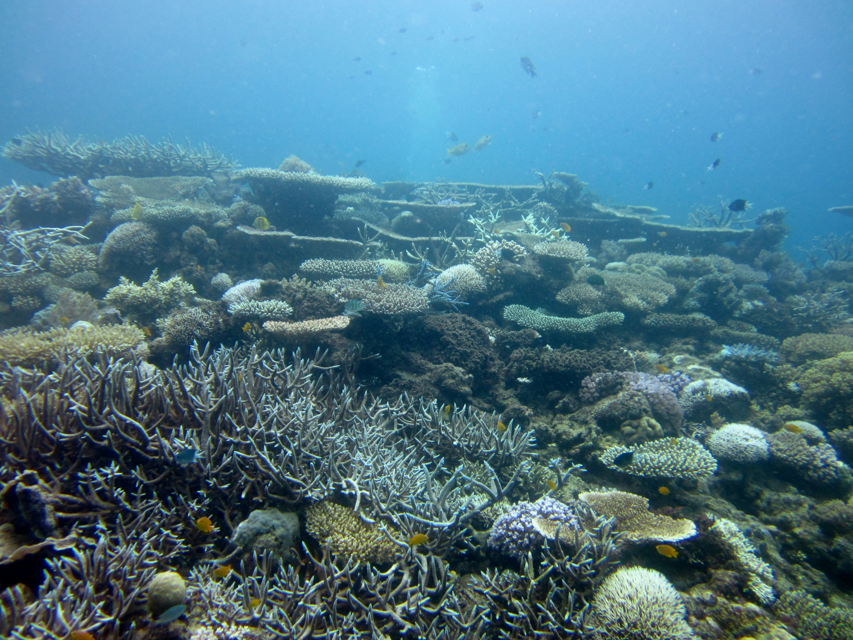 The thing is, not all coral species respond to bleaching equally, which means that the relative proportions of coral species on the reef after bleaching events can shift substantially. Of particular concern are the Acropora corals, which comprise >100 species and play a key role in creating the intricate reef structure that fish and other reef creatures depend upon. Unfortunately, Acropora corals are some of the most likely to die following bleaching events, leaving the more robust and less intricate “massive” corals to dominate. Even without 100% mortality, fewer Acropora colonies reduces the chance that eggs and sperm meet and fuse as they drift through the water after spawning. As a result, although we might see reefs regenerate towards their original coral cover, the combination of coral species, and the food and structure they can provide, can be radically different.