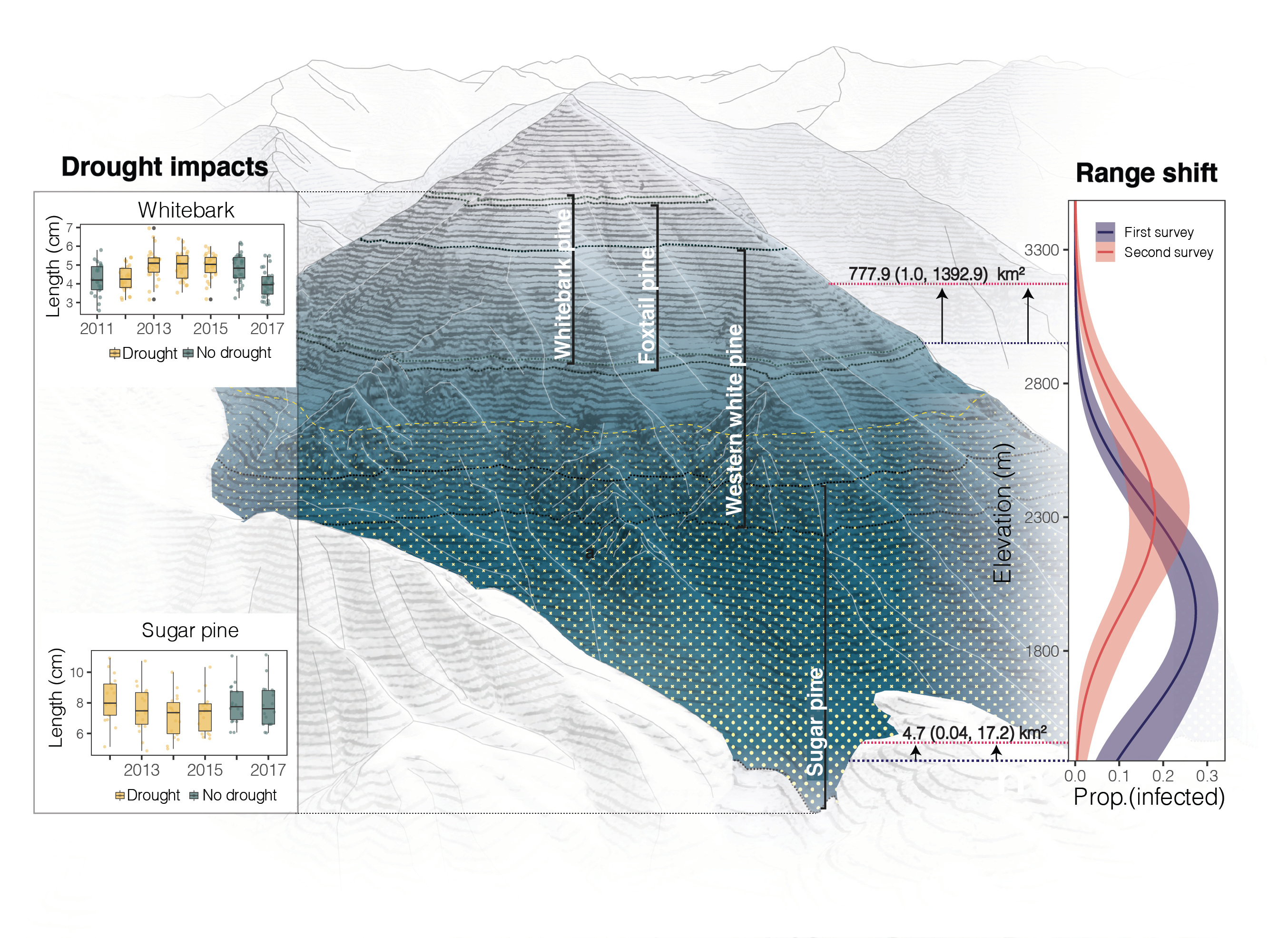 Figure 2. Showing differences in needle growth during drought (yellow boxplots) at high elevation (whitebark pine) vs. low elevation (sugar pine). Mountain figure shows four white pine host ranges; blue shading represents the declining alternate host abundance with elevation; yellow dots illustrate predicted declines in needle growth during drought. On the right, the figure and horizontal lines show the disease range shift between the first survey (blue lines) and second survey (red lines). Mountain figure designed by Zuzanna Drozdz.