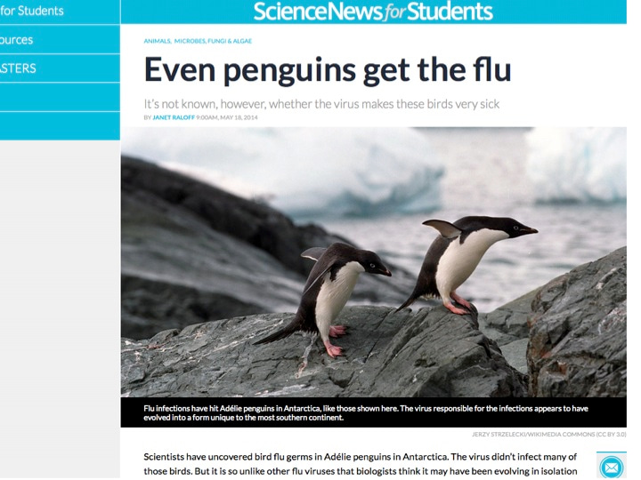 Raloff J. (2014) Even penguins get the flu. Science News for Students. https://www.sciencenewsforstudents.org/article/even-penguins-get-flu