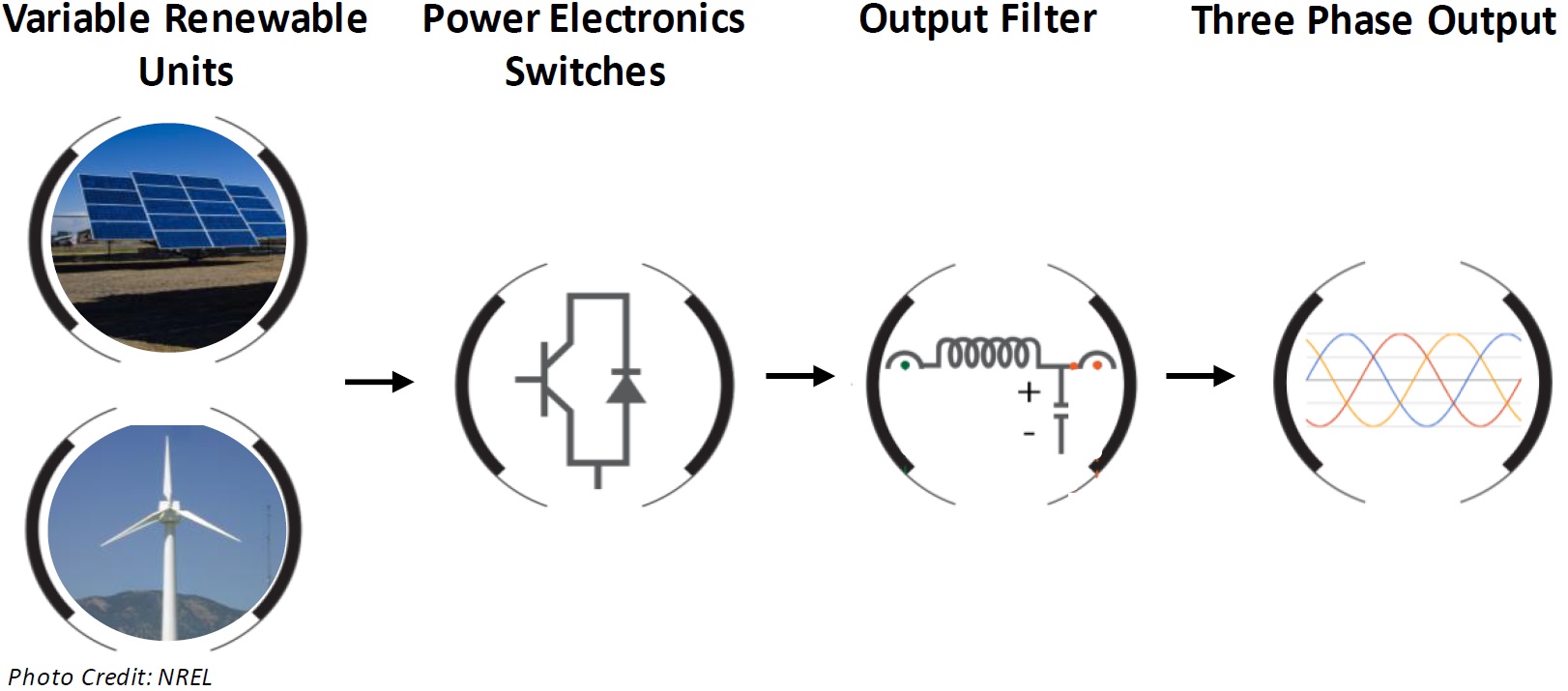 In almost all conventional power plants, electricity is generated using synchronous generators. These generators transform mechanical power – derived from disparate fuel sets such as coal, natural gas, nuclear fission, hydro, etc. - directly into alternating current electric power (see Fig. 2). Over the past century, synchronous generators have matured and presently offer a reliable performance for the bulk generation of electricity. Renewable energy resources are most often integrated into power grids with a power electronic interface known as an inverter (see Fig. 3); these are inverter-based resources. Inverter-based resources can be broadly categorized by the primary control mode as either (i) grid-following or (ii) grid-forming, with both classes of inverters have similar hardware components and the structure differing chiefly in the control scheme. The primary control mode has a considerable impact on the device interaction with the electric power grid. Grid-following inverters, the most common class of inverters, rely on a phase-locked loop to estimate and track the frequency at the point of interconnection; a present and stable voltage waveform is required. Typically, the control objective of these devices is to maintain a set power export regardless of varying grid conditions, but active power and reactive power can be adjusted according to desired relationships to frequency and voltage deviations for grid support. In contrast, grid-forming inverters, an emerging and promising technology as applied to the parallel operation in bulk power systems, adjust the frequency and voltage according to power injection deviations at the point of interconnection. In other words, these devices support the grid by generating a local voltage phasor (constituting phase and magnitude) independent of the grid operating conditions. A distinguishing constraint in grid-forming control is the necessity of available positive headroom to perform these control objectives.
