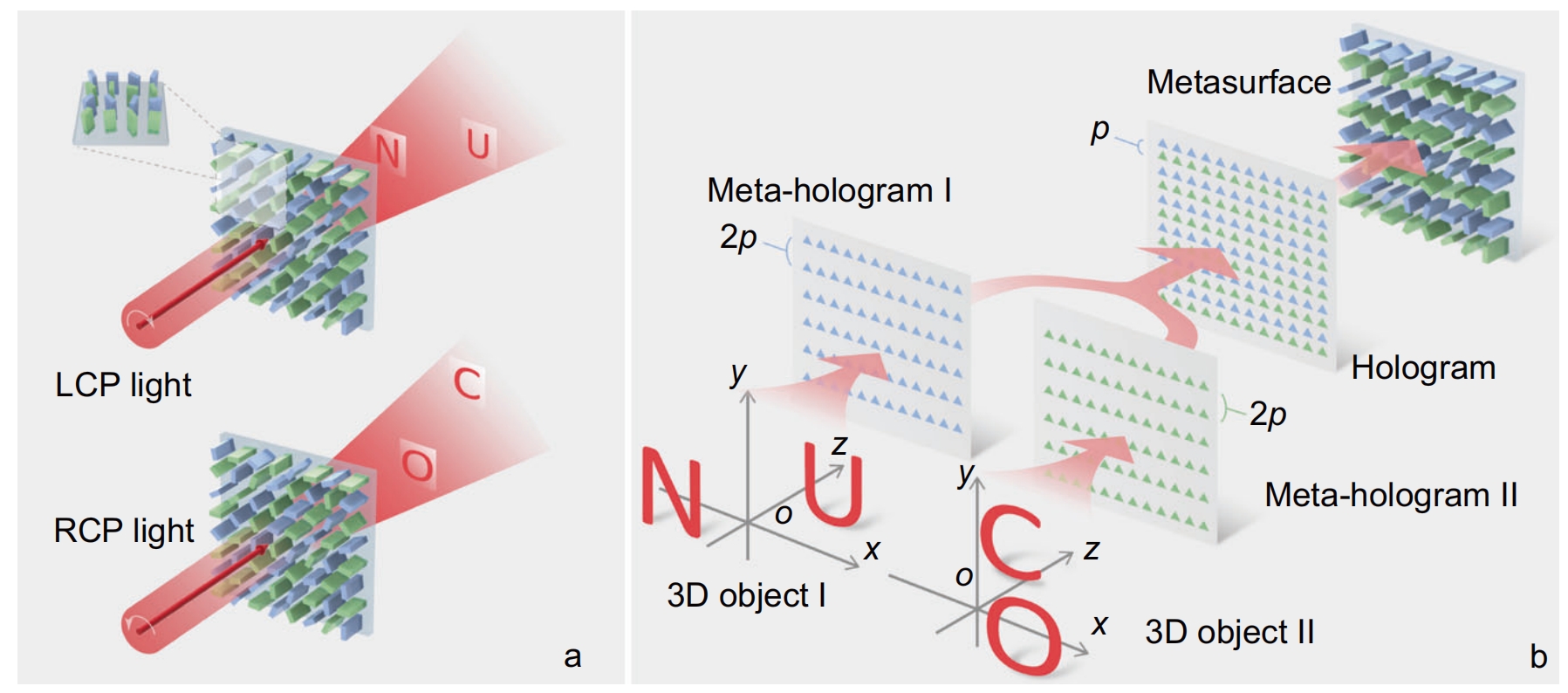 The designed metasurface is based on the principle of geometric phase control to realize the independent control of light field phase for each unit cell. The unit cell of the metasurface consists of a rectangular amorphous silicon nanorod fabricated on a quartz substrate. The Pancharatnams-Berry phase is utilized for a broadband non-dispersive phase control by rotating the principle axis of the birefringent nanorod. The relationship between the PB phase shift φ and rotation angle θ satisfies φ=±2θ, where the positive sign is taken when the polarization state of the incident light is LCP, and the negative sign is taken when the polarization state is RCP. The schematic illustration of the proposed metasurface for encoding the hologram and manipulating the corresponding polarization states simultaneously is shown in Fig. 1b. For two different 3D objects, the corresponding meta-holograms I and II are calculated based on the angular spectrum diffraction theory. The two meta-holograms correspond to the a pair of orthogonal circular polarization states, respectively. The pixel spacings are p and 2p along x and y directions, respectively. To reduce the interference between adjacent phases, we use line-by-line insertion to synthesize two sub-holograms into a final hologram, thus obtaining the complex amplitude modulation information corresponding to the metasurface. When LCP or RCP light irradiates the metasurface, holographic reconstruction of different 3D objects with large depth can be realized. This function is realized by the complex amplitude modulation of two orthogonal polarization bases provided by the metasurface, which is difficult to realize by using spatial light modulators in the traditional optical systems.