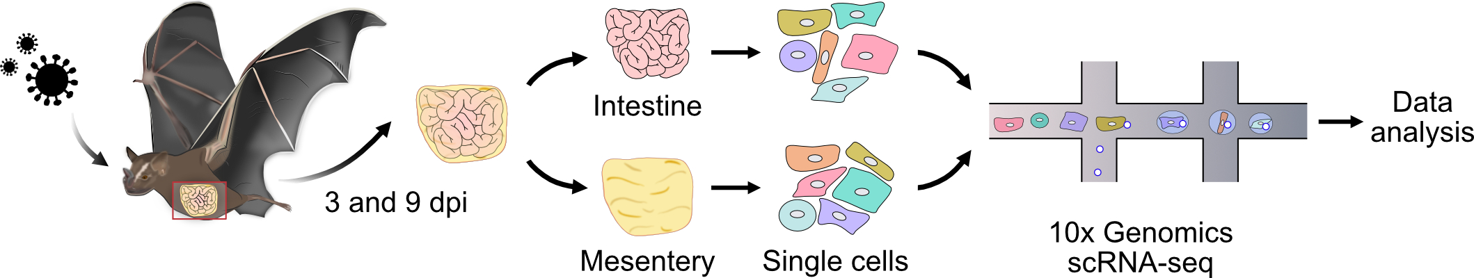 We infected Jamaican fruit bats with two variants of the bat IAV H18N11: the wild-type virus (WT) and a mutant lacking the non-structural protein 1 (ΔNS1). NS1 of IAV is known to play a crucial role in antagonizing the host immune response, thereby facilitating viral replication. We then processed the intestine and mesentery of these bats at 3 and 9 days post-infection for single-cell RNA sequencing (scRNA-seq), including mock-infected controls. With the help of Geoffroy Andrieux, a highly skilled bioinformatician from Freiburg, we were able to decipher the large single-cell sequencing dataset.