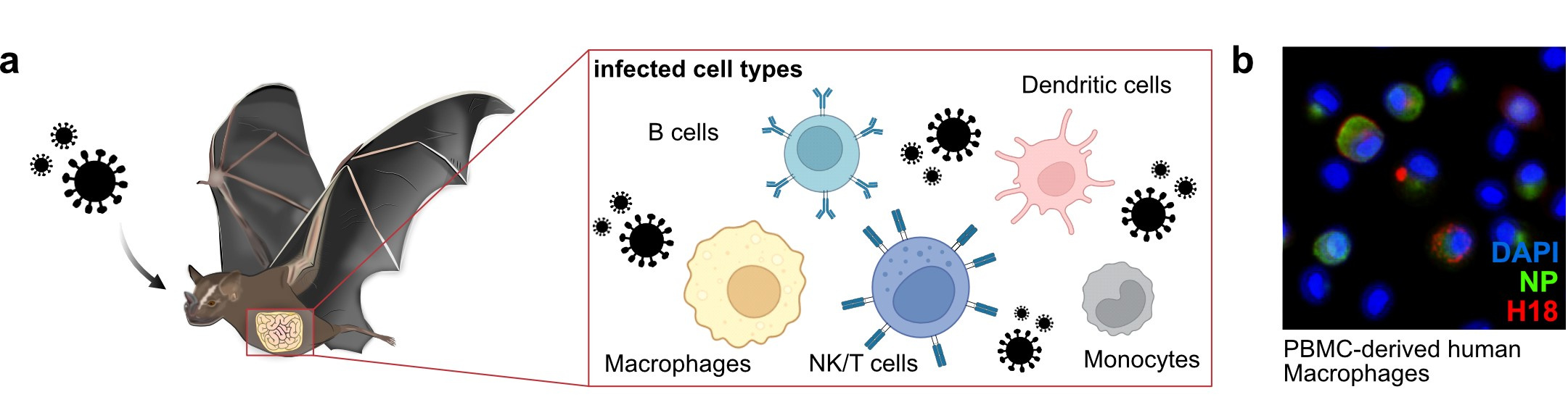 In a previous study, we showed that the bat influenza A virus (IAV) H18N11 uses major histocompatibility complex II (MHC-II) for cell entry. This was surprising because all conventional IAVs use sialic acid for cell entry. This shift to using a proteinaceous receptor instead of glycans intrigued us. Classic IAVs mainly infect epithelial cells, but these cells rarely express MHC-II. So, which cell types does the virus infect?