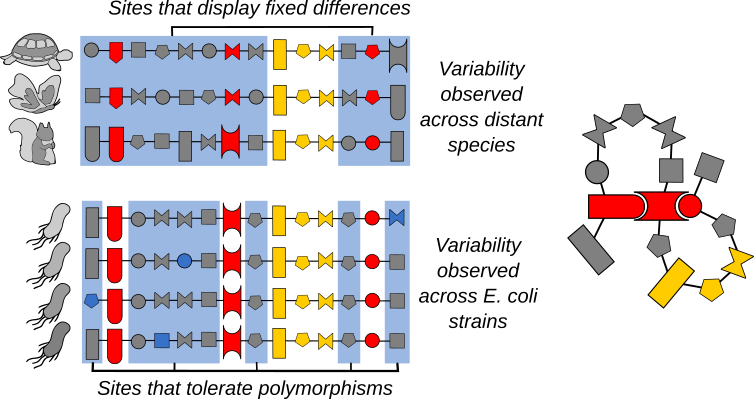 Let’s consider a simple example (Figure 1). If a residue, such as the one in yellow, is conserved throughout the alignment of homologous protein sequences, it is likely to be crucial to ensure the functionality of the protein. Over millions of years of evolution, whenever a mutation has occurred there, it has been eliminated by natural selection. Therefore, it is unlikely to ever be a polymorphic site, as any amino-acid change would have a detrimental effect on the functionality of the protein.