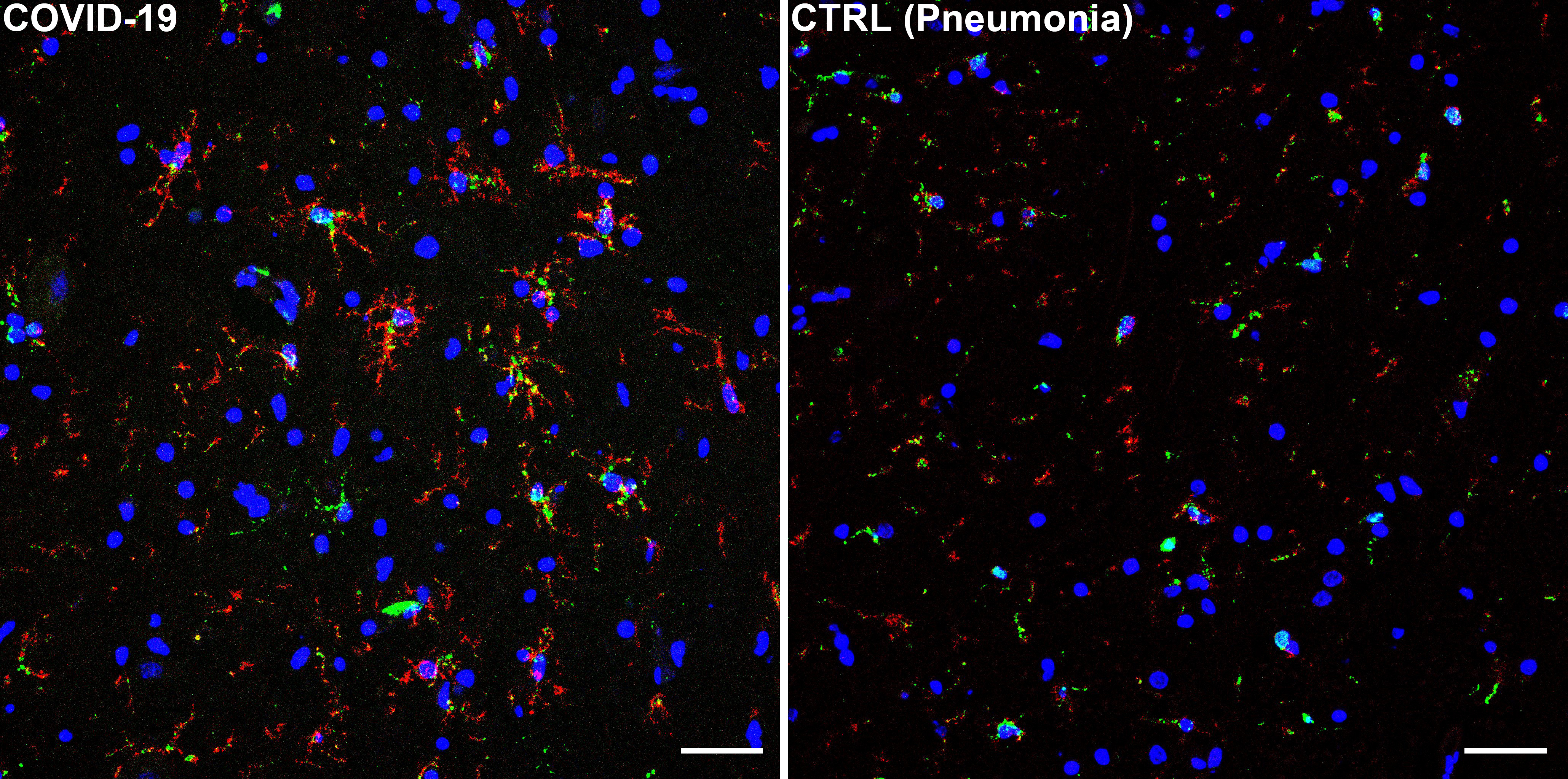 Conversely, prominent inflammatory pathology was found. Resident immune cells of the brain, known as microglia, displayed an activated phenotype with increased phagocytic activity. The phenotype of microglial cells was also different when compared to our control group, indicating prominent activation in COVID-19.