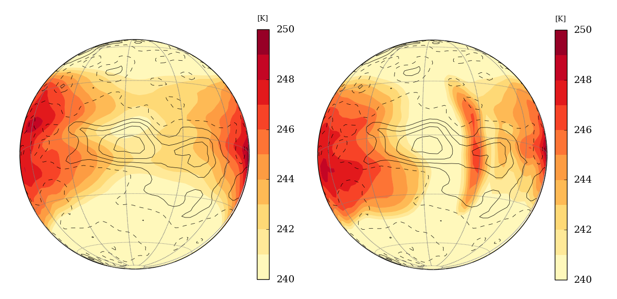 (simulated cloud top temperature, with mountain effects on the right, without on the left)