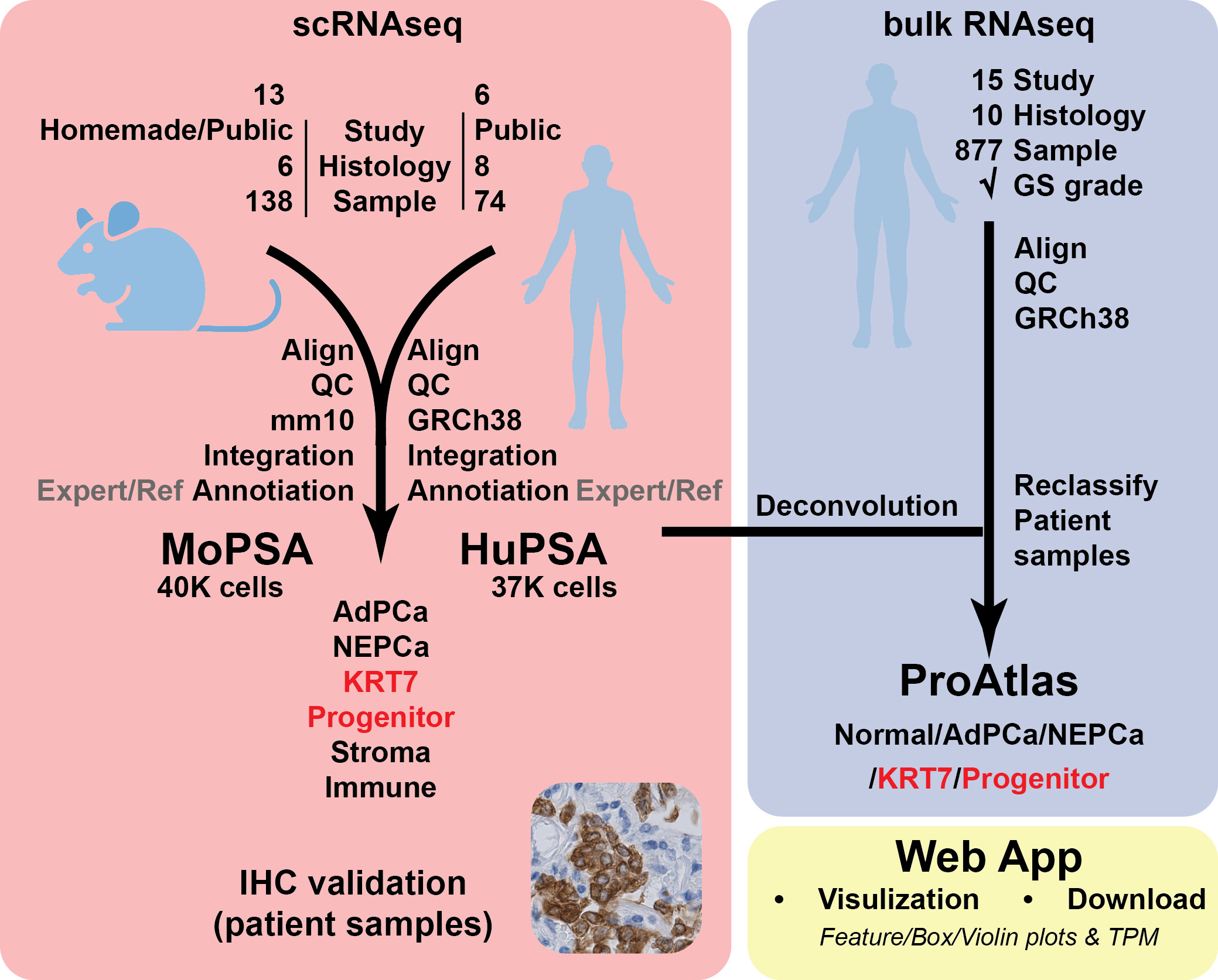 In our recently published paper, summarized in Figure 1, we performed a comprehensive and rigorous multi-omics study on prostate cancer samples from both humans and mice. We generated two prostate cancer single-cell datasets named HuPSA (human) and MoPSA (mouse) to describe cancer and stromal cell populations. Regarding cancer heterogeneity, we identified various AR+ prostate adenocarcinoma populations, neuroendocrine prostate cancer population, and, more importantly, two novel AR-/NE- populations named KRT7 and progenitor-like. We validated the existence of these novel populations using bulk RNAseq and immunohistochemistry. These identifications provided new diagnostic markers and laid the foundation for future mechanistic studies on these alternative phenotypes to develop new treatment strategies.
