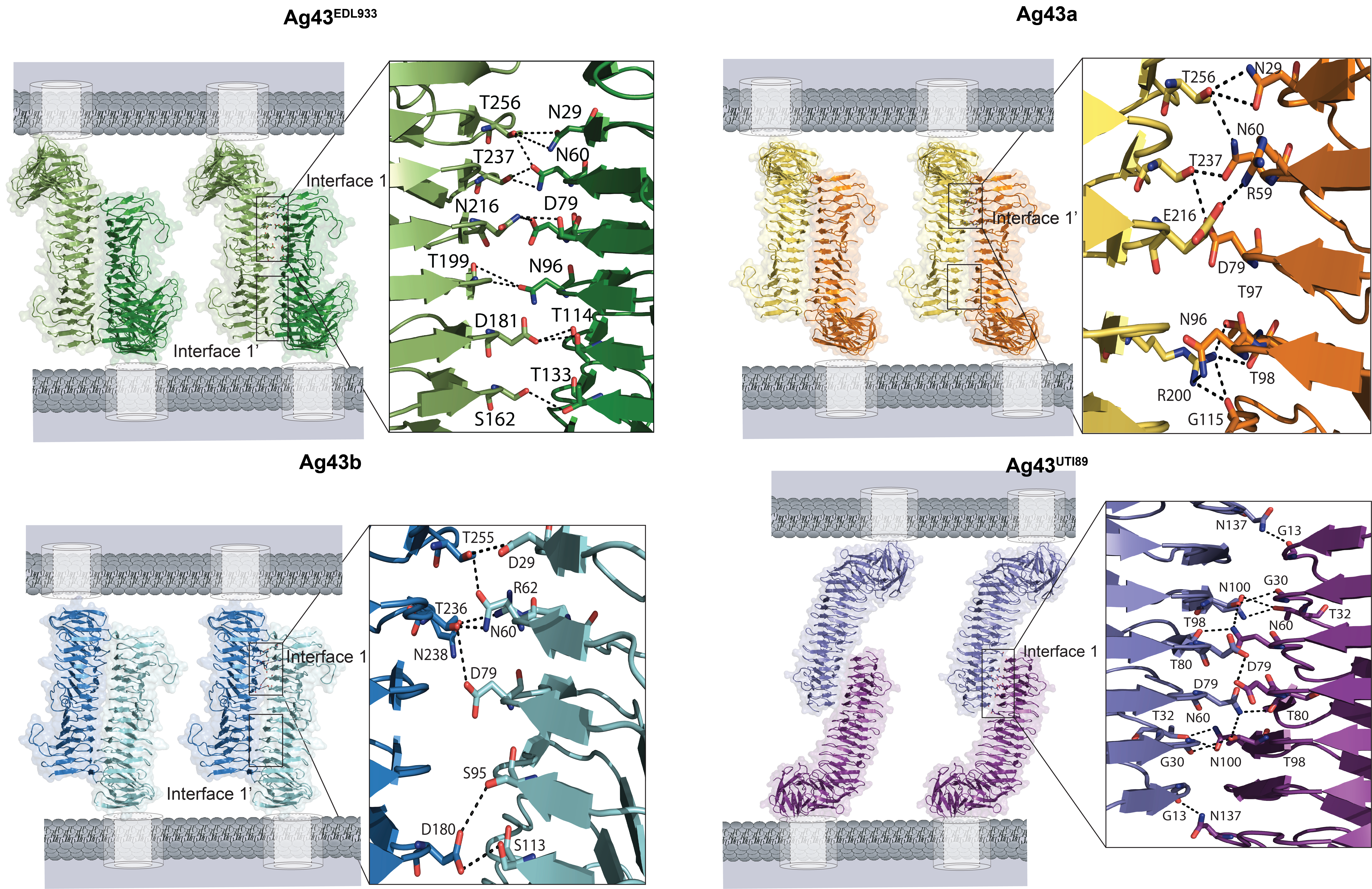 Interaction interfaces of Ag43EDL933, Ag43a, Ag43b and Ag43UTI89 depicting the head-to-tail manner.