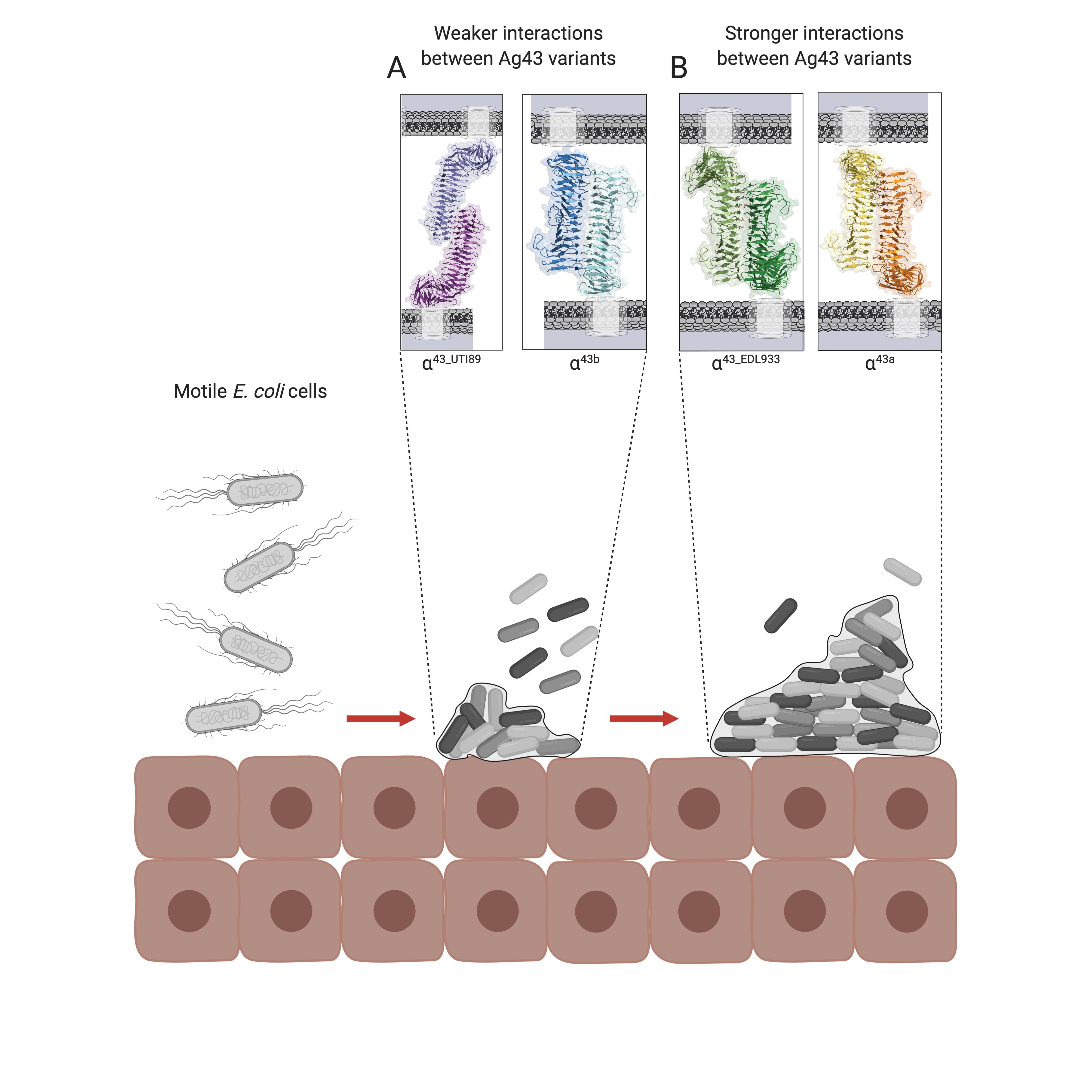 Model showing how variations in the self-association interactions in Ag43 homologues can lead to different levels of bacterial compacting within biofilms (Image created with Biorender).