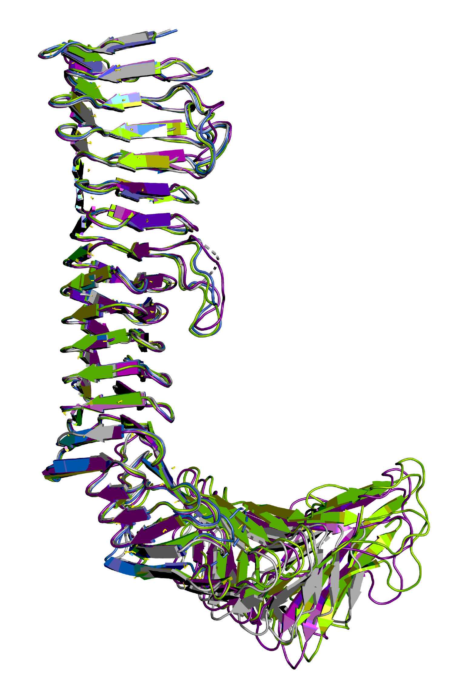 The structures of Ag43b (blue), Ag43EDL933 (green), Ag43UTI89 (purple) and the reference Ag43a (grey) superimposed to show the L-shape architecture they all adopt.