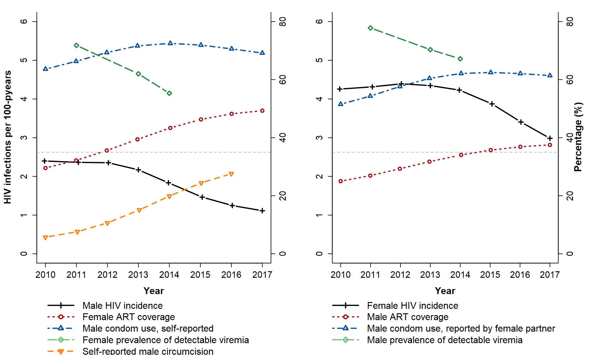 We found that ART uptake was indeed higher among women, but this translated into larger declines in HIV incidence among men. In fact, male incidence was the first to decline between 2012 and 2017, from 2.5 to 1.0 new infections per 100 person-years—a reduction of 59%. This reduction was markedly higher than the 37% decline among women, from 4.9 to 3.1 new infections per 100 person-years between 2014 and 2017 (Fig. 3). How can these unequal declines in HIV incidence be explained?