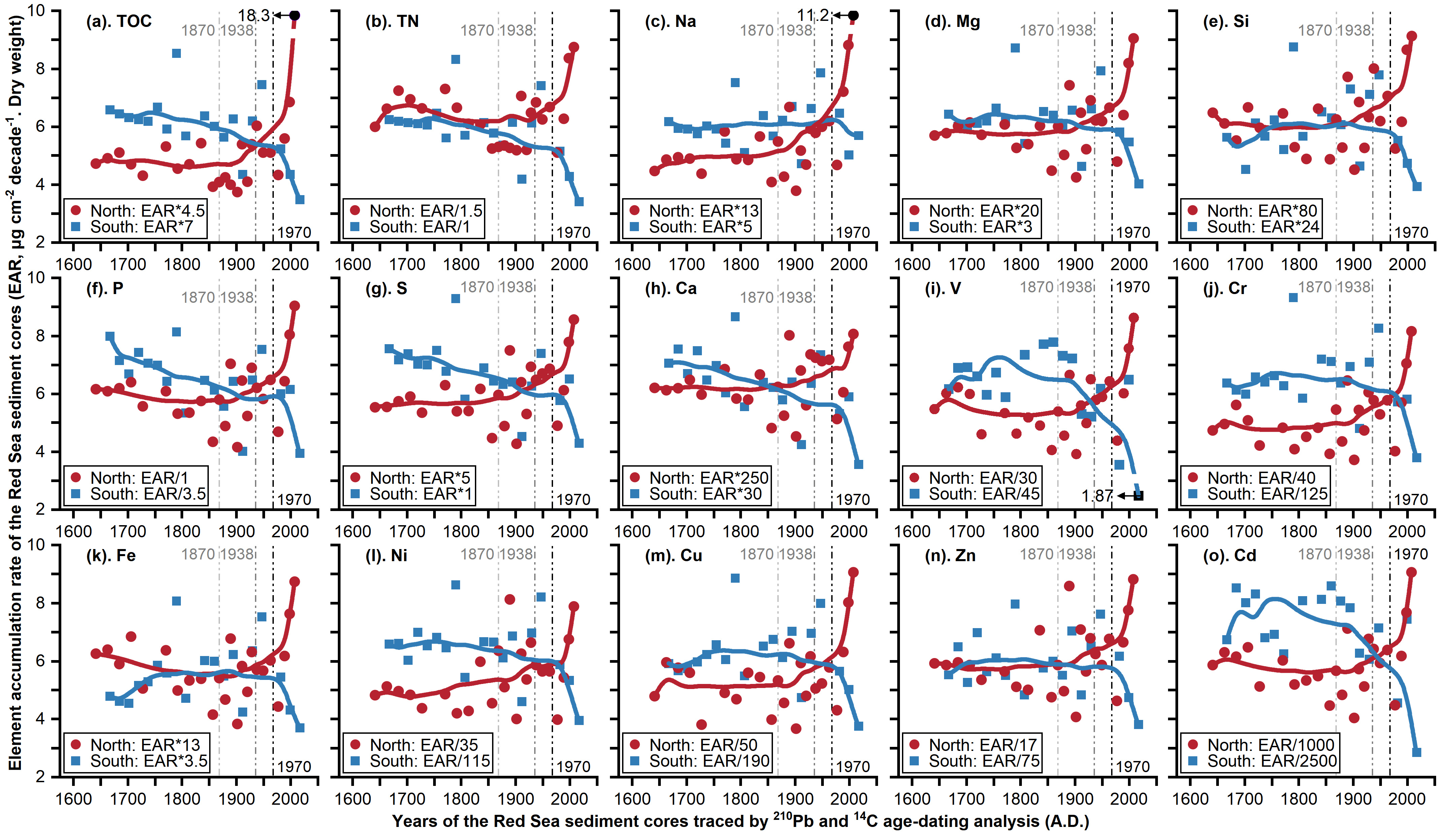 At that moment, I considered our findings intriguing, though not groundbreaking, so we prepared to submit our research to journals specializing in environmental studies. Then, fortuitously, Prof. Susana Agusti proposed calculating the element accumulation rates (EARs) in our sediment cores to gain a deeper understanding of the Red Sea's environmental evolution over recent centuries. Upon reviewing the scatter plots of the EARs, we were astonished to find a marked decline in the EARs in the South Red Sea, contrasted by an exponential increase in the North (Figure 2). Regrettably, I was unable to account for these temporal variations and thus set aside this manuscript for several years to concentrate on other aspects of my Ph.D. thesis.