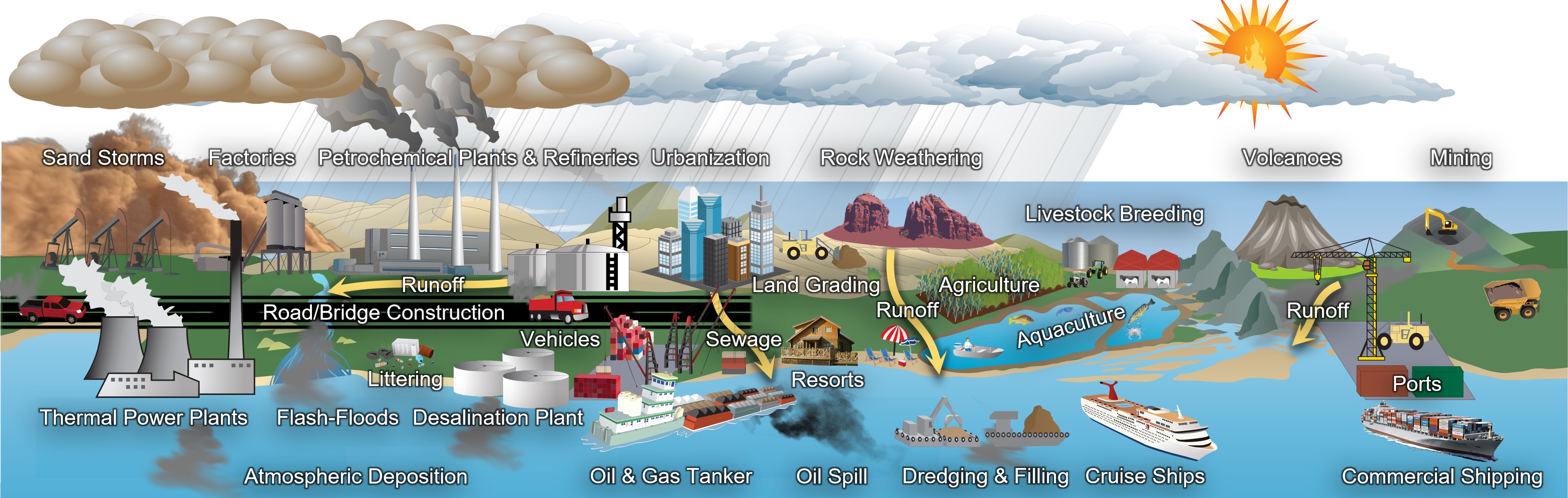 Subsequently, Prof. Susana Agusti and I collected and analyzed zooplankton from both open and coastal regions of the Red Sea, sediment cores from coral reefs, and leaves and sediments from mangroves and seagrasses. Through this extensive research, we became aware of the significant heavy metal pollution in the Red Sea, especially in the Northern region. This pollution was attributed to the increase in shipping activities since the Suez Canal's opening in 1869, coupled with the rapid industrialization along the Saudi Arabian Red Sea coast that followed the discovery of the first oil field in Saudi Arabia in 1938. The development of oil-related sectors—including oil refineries, petrochemical plants, accidental oil spills, and high-pollution industries such as cement factories and power plants burning crude oil as fuel—contributed to this environmental issue (Figure 3). Moreover, the semi-enclosed structure of the North Red Sea basin, the lack of river inputs, scant precipitation, and high seawater evaporation rates, all contribute to limiting water exchange and causing pollutants to persist in the aquatic environment. These conditions helped explain why the EARs in the North Red Sea sediment cores had increased exponentially over the past century.