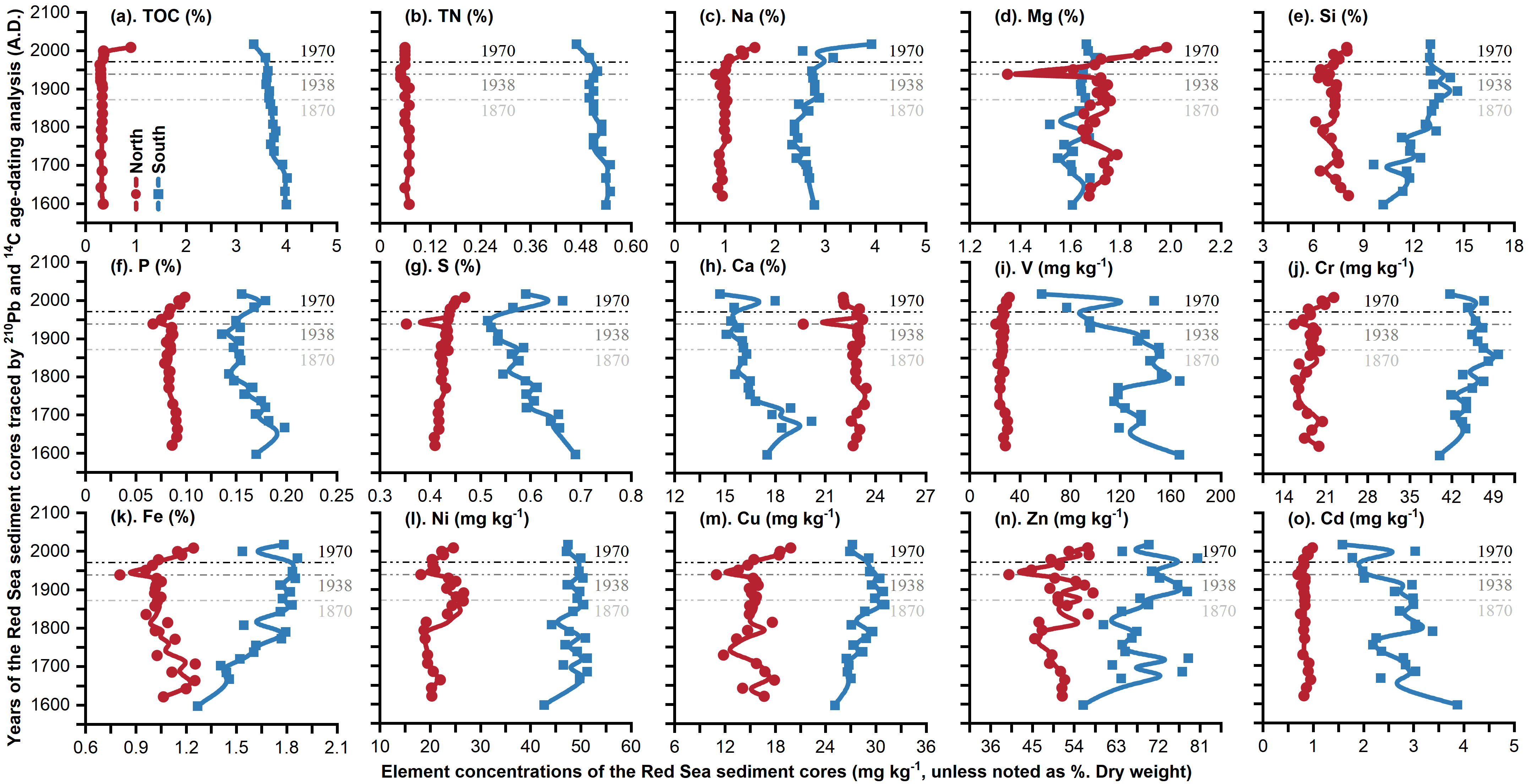 In 2018, I was fortunate to commence my Ph.D. studies at King Abdullah University of Science and Technology (KAUST) in Saudi Arabia. At that time, my supervisor, Prof. Susana Agusti, was in the process of planning to measure element concentrations in two sediment cores collected from the South and North of the Saudi Arabian Red Sea in 2017. Considering my background in heavy metal pollution research, she deemed me a suitable candidate to assist in the element analysis at KAUST's Analytical Chemistry Core Lab. By December 2018, after approximately two months of diligent work, we completed the laboratory analysis. Subsequently, I created scatter plots (Figure 1) to depict the concentrations of 21 elements. These included nutrient elements such as total organic carbon (TOC), total nitrogen (TN), and phosphorus, as well as heavy metals—or trace metals—like chromium, iron, and nickel, in the sediment cores.