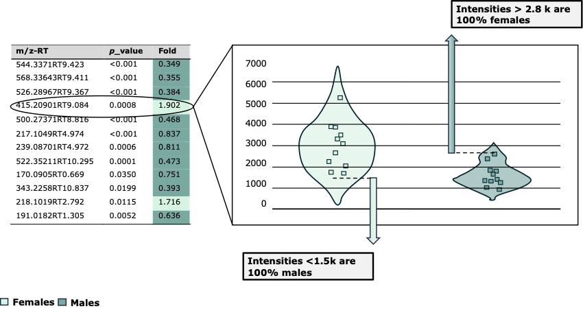 To achieve this, we analyzed the individual values and their intensities in both groups, creating several graphs, such as the one shown in Figure 2. In this case, for the metabolite 415.20901RT9.084, we found that the values were significantly higher in females than in males (p=0.0008). Specifically, values below 1.5 allowed for the classification of 100% of males, while levels greater than 2.8 indicated 100% females. After conducting several studies of this nature and maintaining a stringent approach, this work concludes with some candidates identified as biomarkers for sex classification in the early life stages of this species.