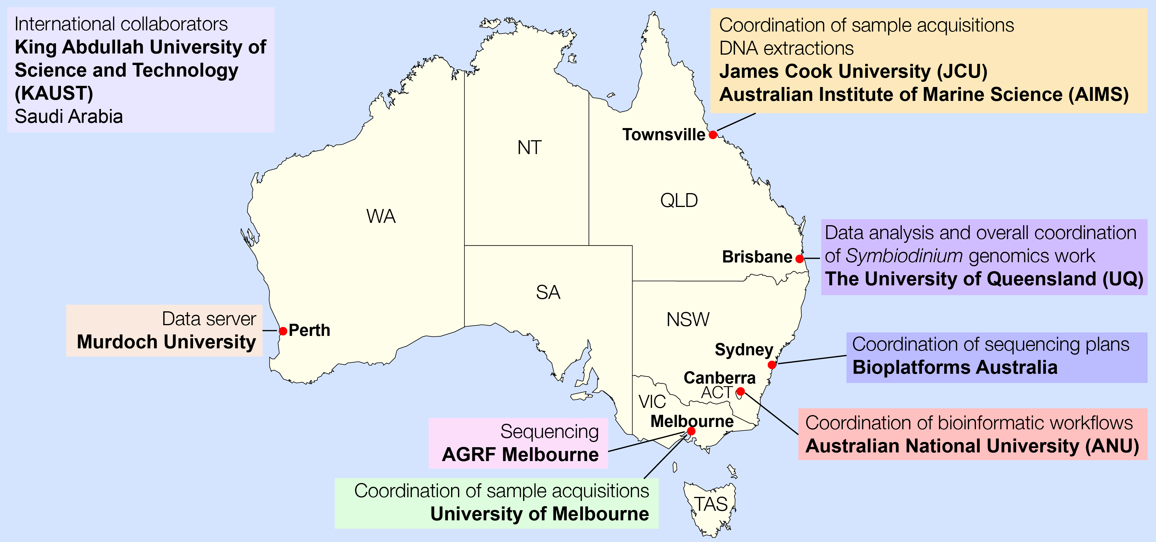 The genomic DNA from these Symbiodinium isolates was then extracted at James Cook University and the Australian Institute of Marine Science in Townsville (Queensland). We coordinated the sequencing strategy with Bioplatforms Australia in Sydney (New South Wales), the sequencing was carried out in Melbourne (Victoria), the sequence data were ported via a data server in Perth (Western Australia), and core data analysis was done in Brisbane (Queensland). We received our very first batch of HiSeq 2500 sequence data on 25 September 2013. It sounds like a lot of effort, and indeed it was.