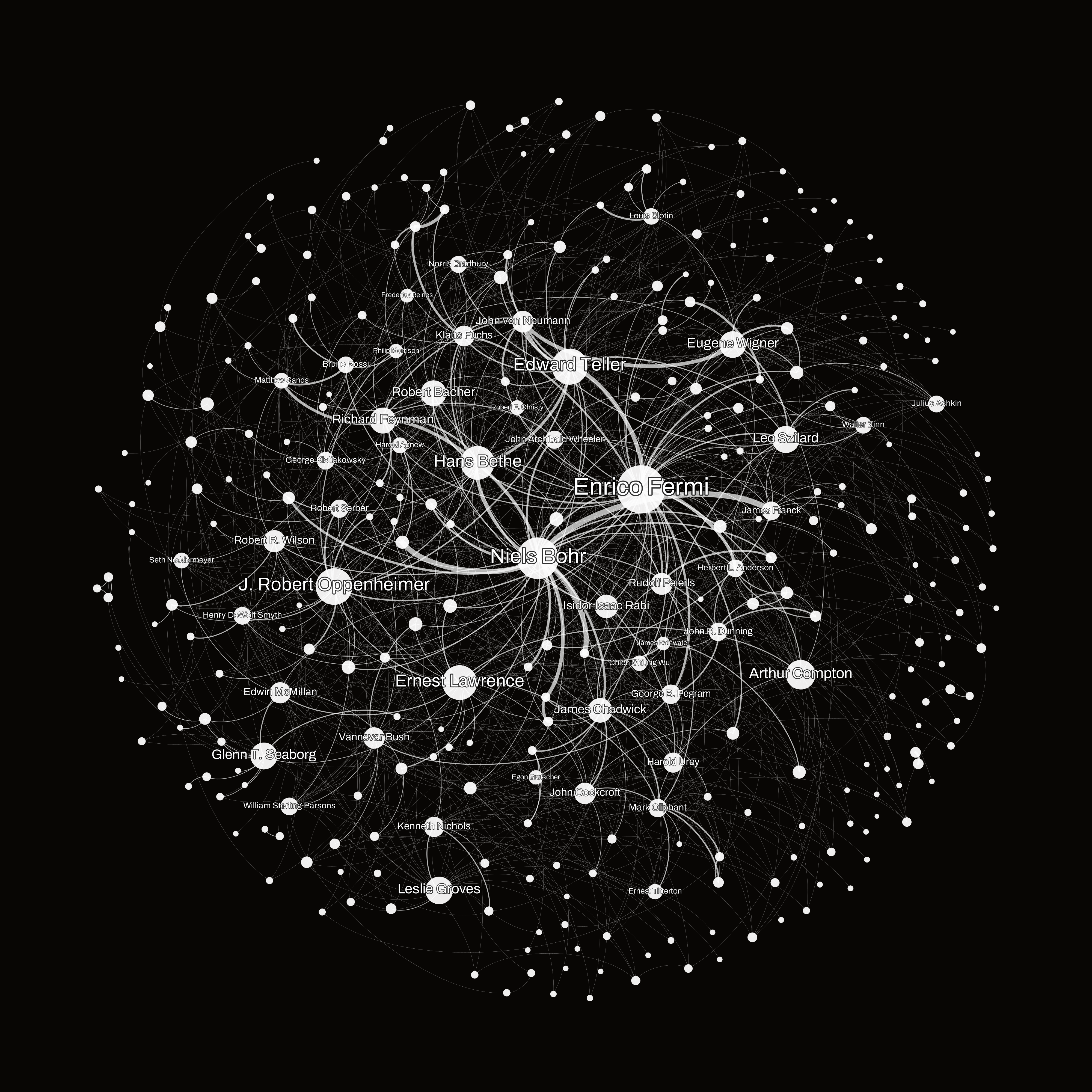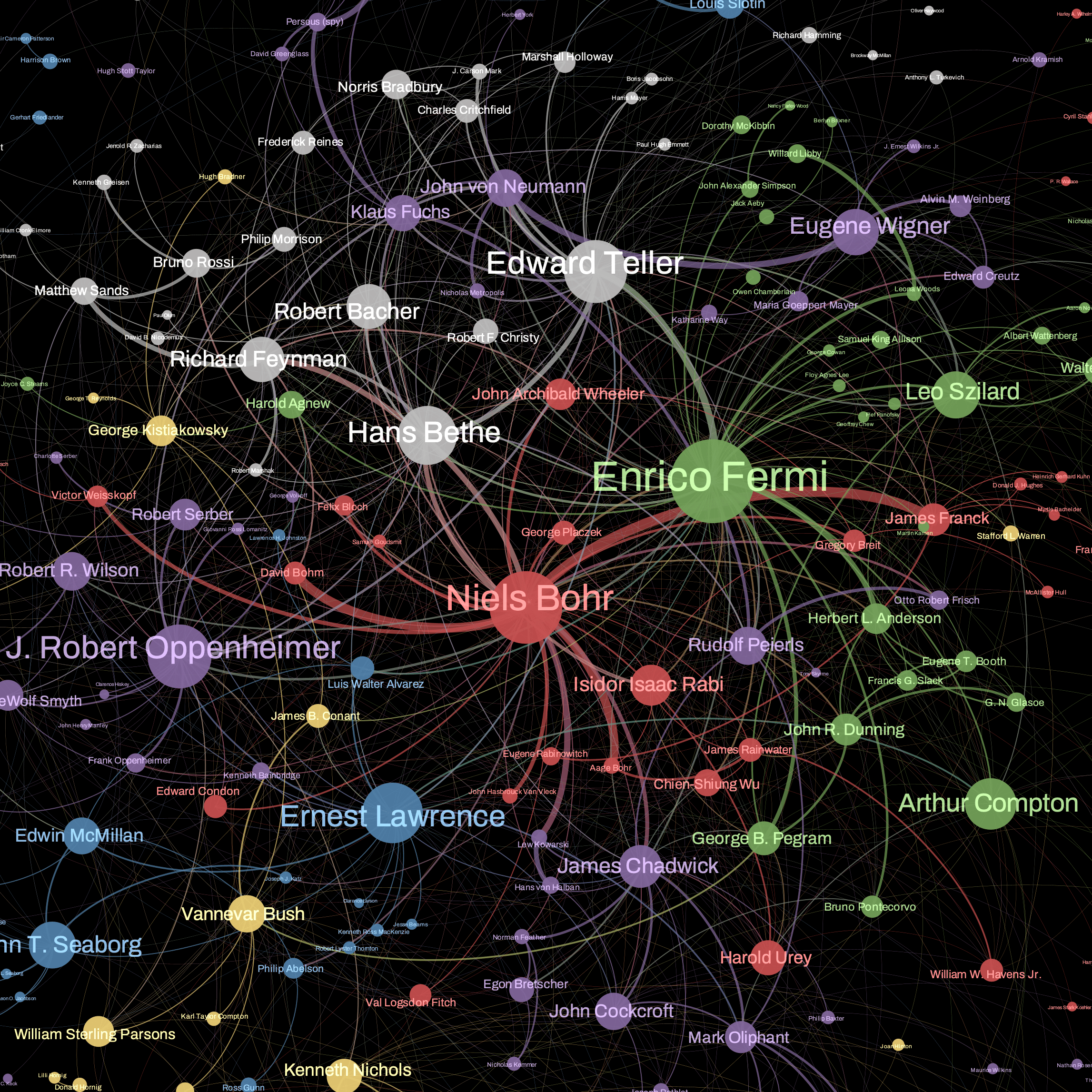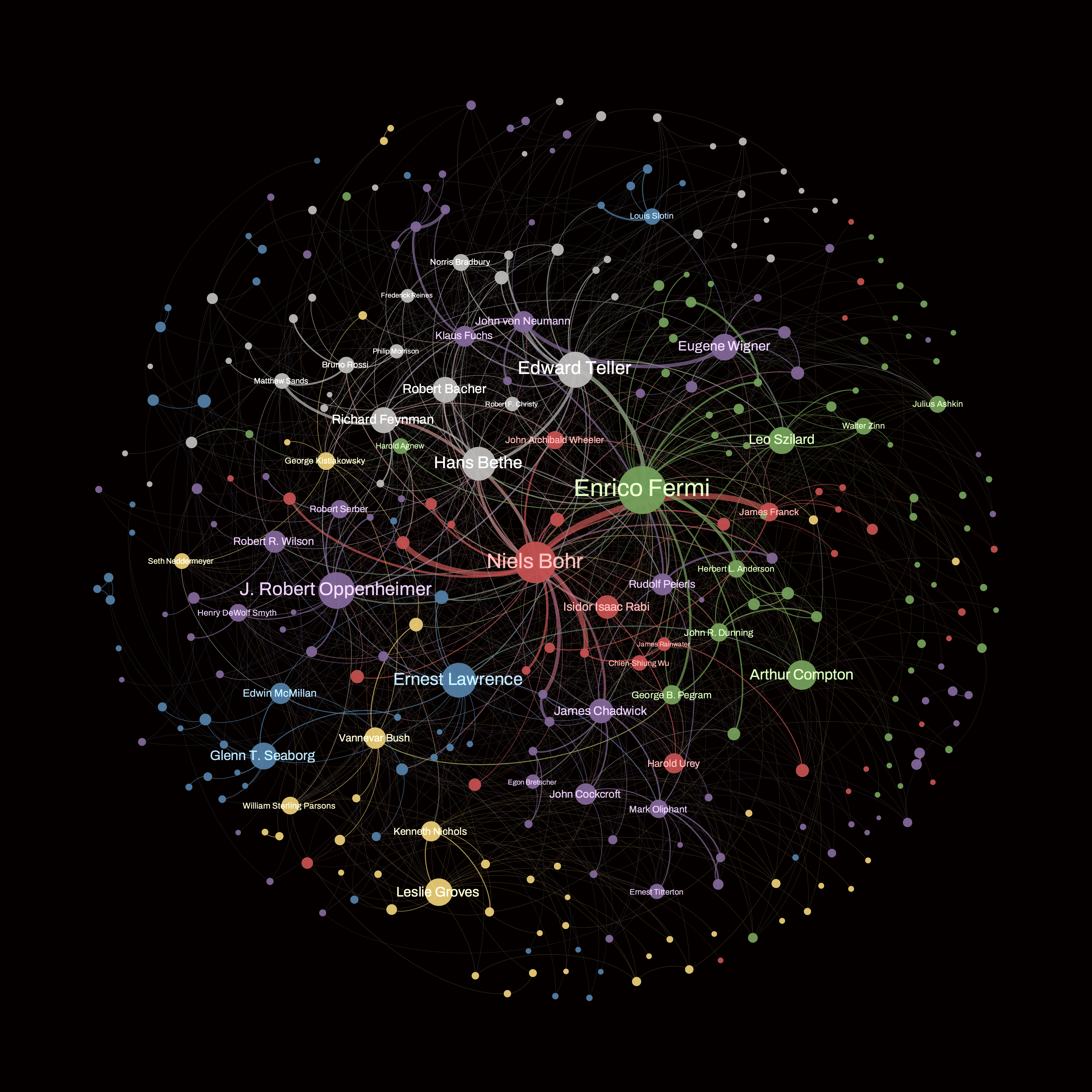 Beyond the pages of history, the project embodies the convergence of human endeavor—distinguished minds across varied disciplines united for a common goal. This analysis sheds some light on the complex patterns of collaboration and joint efforts that allowed such great minds to connect, work in teams, and succeed at such an enormous scale. Additionally, the way I built this network illustrates how network science can be applied to nearly any social system, quantitatively capturing the invisible relations, and helping to interpret the hidden patterns underneath.