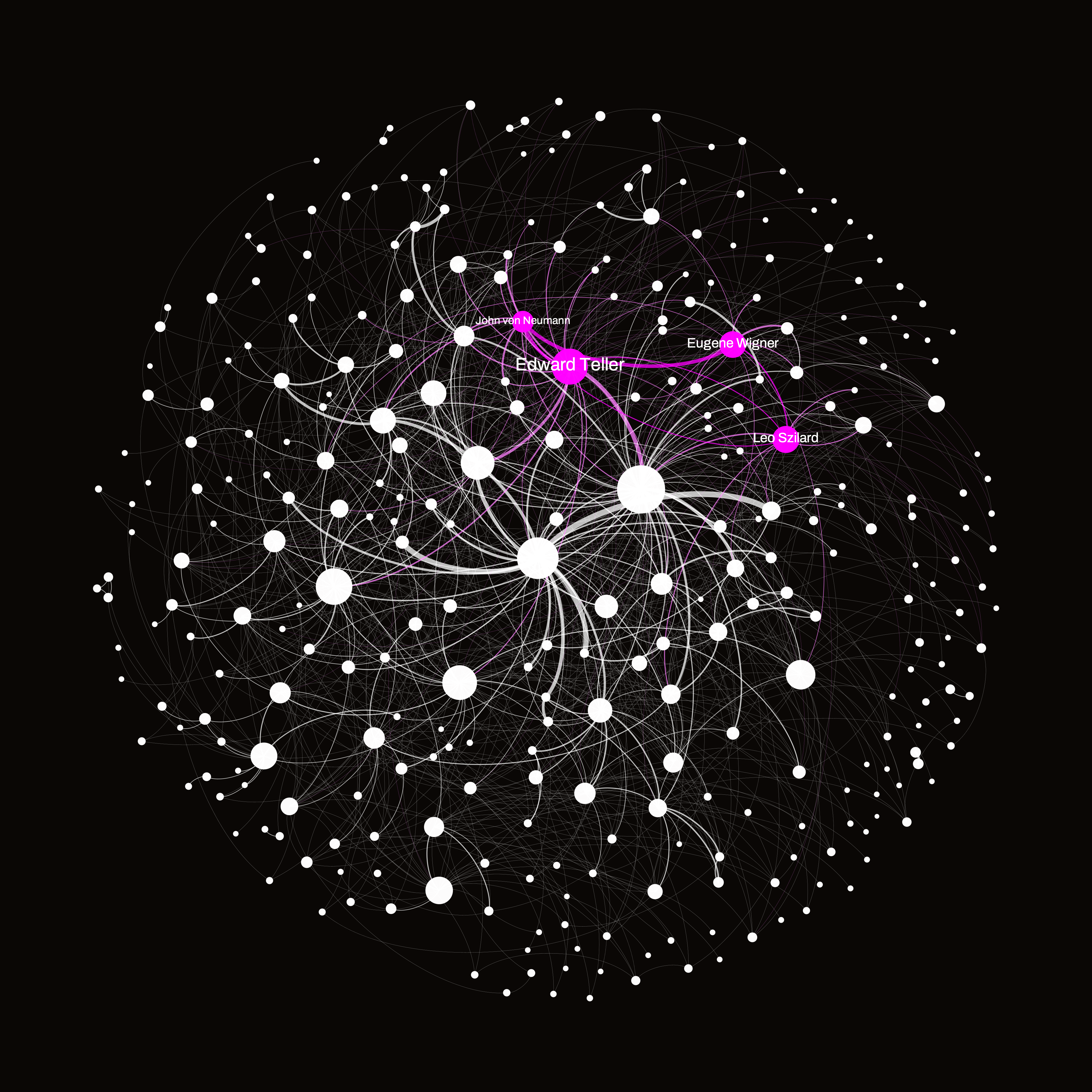 One last observation to a personal accord: At first sight, the connections between the Hungarian immigrant Martians [6] Teller, Wigner, Szilard, and Neuman were hard to spot, despite their foundational role in the dawn of the atomic era and countless joint projects. However, once I highlighted them on the network, my expectations were quickly confirmed. They are all closely linked though not exclusively, meaning that they were also very well embedded in the American scientific community at that time. This is probably best illustrated by the so-called Einstein Szilard letter, written by Szilard who also consulted with Teller and Wigner, and which was ultimately signed by and sent to President Roosevelt by Einstein. A fun fact about this letter: during those days, Einstein was spending his vacation on the beach, so Szilard visited him right there. And as Szilard didn’t own a driver’s license, Teller was driving him [7].