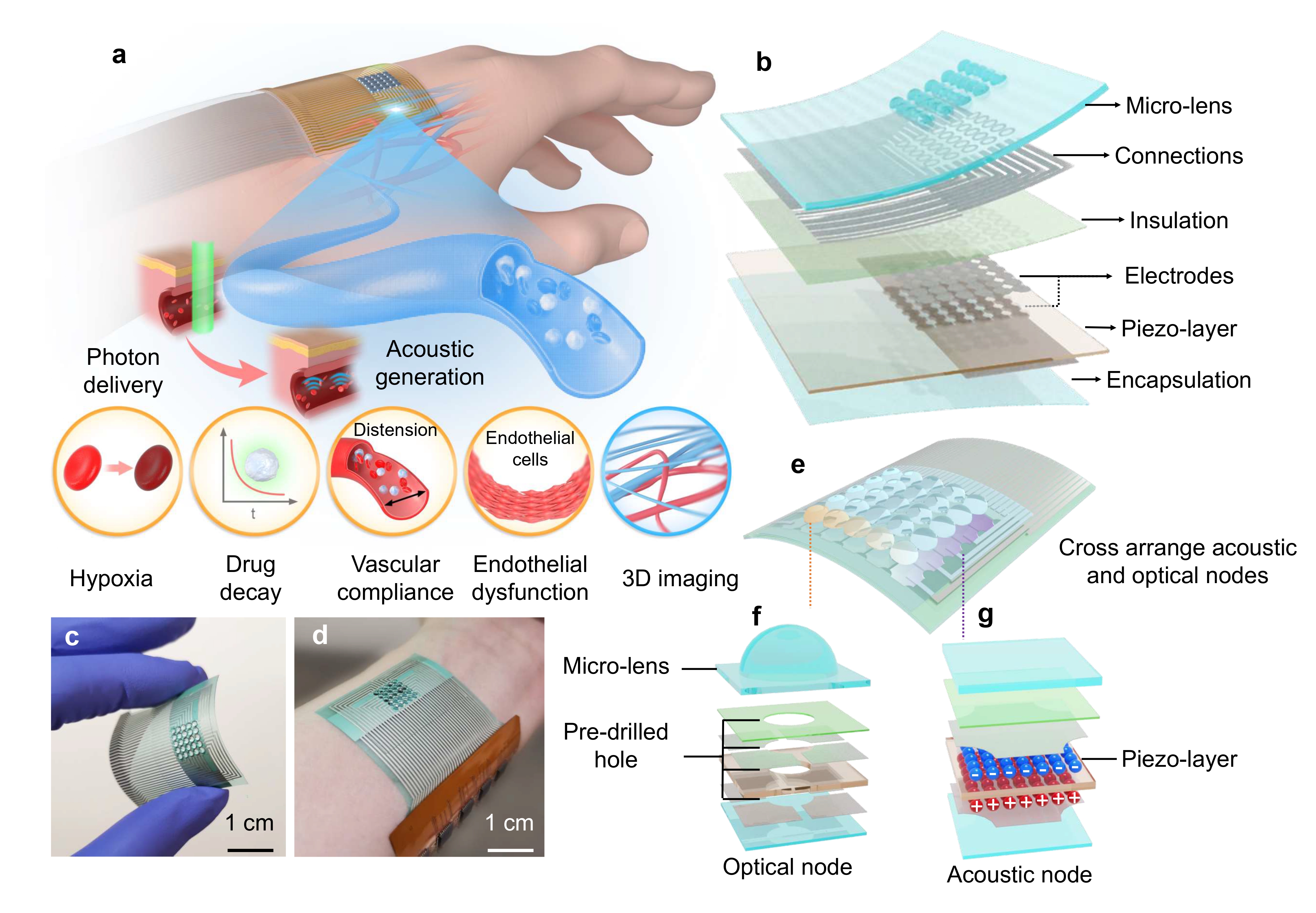 Fig. 1 | Design and working principle of the OBS. a Schematic illustration of the OBS laminated on the surface of the hand. The OBS is based on the optoacoustic effect and can monitor hypoxia, exogenous agent decay, vascular compliance, and endothelial dysfunction. Meanwhile, OBS can map the blood information to a 3D distribution model. b Schematic layout of the OBS: a multi-layered integration of optical (micro-lens), and acoustic (piezo-layer) elements with connection, insulation, electrode, and encapsulation layers. See Methods and Supplementary Figs. 1–2 for the detailed OBS fabrication process. c Photograph of the OBS under bending. d Photograph of the OBS with flexible connecting circuits closely attached to the human wrist. e The cross-distributed acoustic and optical nodes. f, g An exploded view of a single optical (f) and acoustic (g) node.