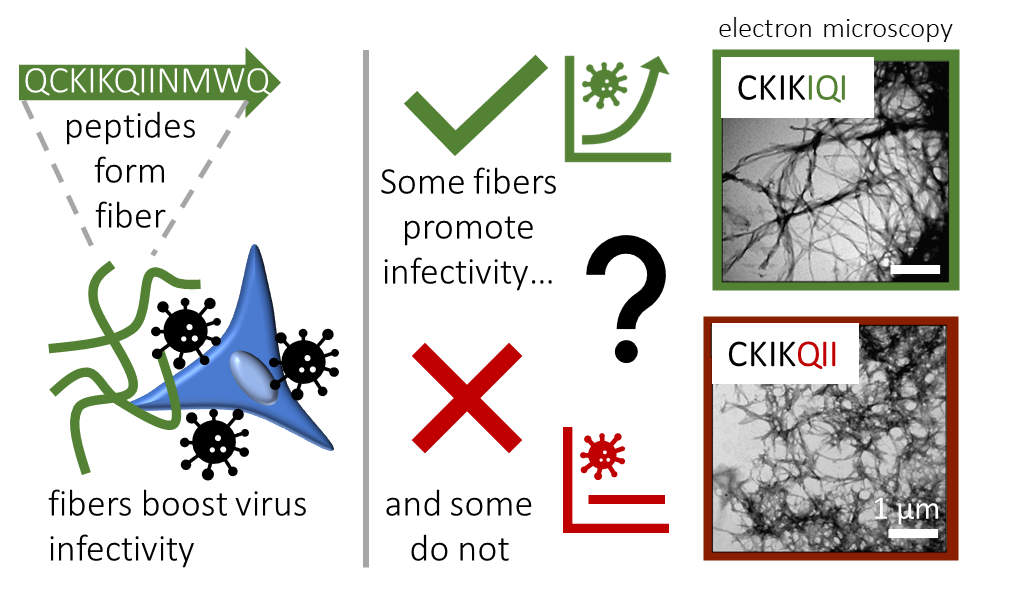 The roots of this project go back to 2013, to a study of Yolamanova, Weil, Münch, and coworkers.[1] They investigated the HIV-1 glycoprotein envelope through high-throughput screening assays and discovered a small protein fragment called “EF-C”. This peptide spontaneously self-assembles into supramolecular fibers with quite interesting properties: The fibers can act as a “glue” between viruses and cells, facilitating the delivery and uptake of viruses into cells which strongly improves efficiency for medical applications. The reason why these peptide fibers were so active was primarily attributed to their positive charge, which helped overcome the natural electrostatic repulsion between viruses and cells. However, back then this question had not been studied in detail.