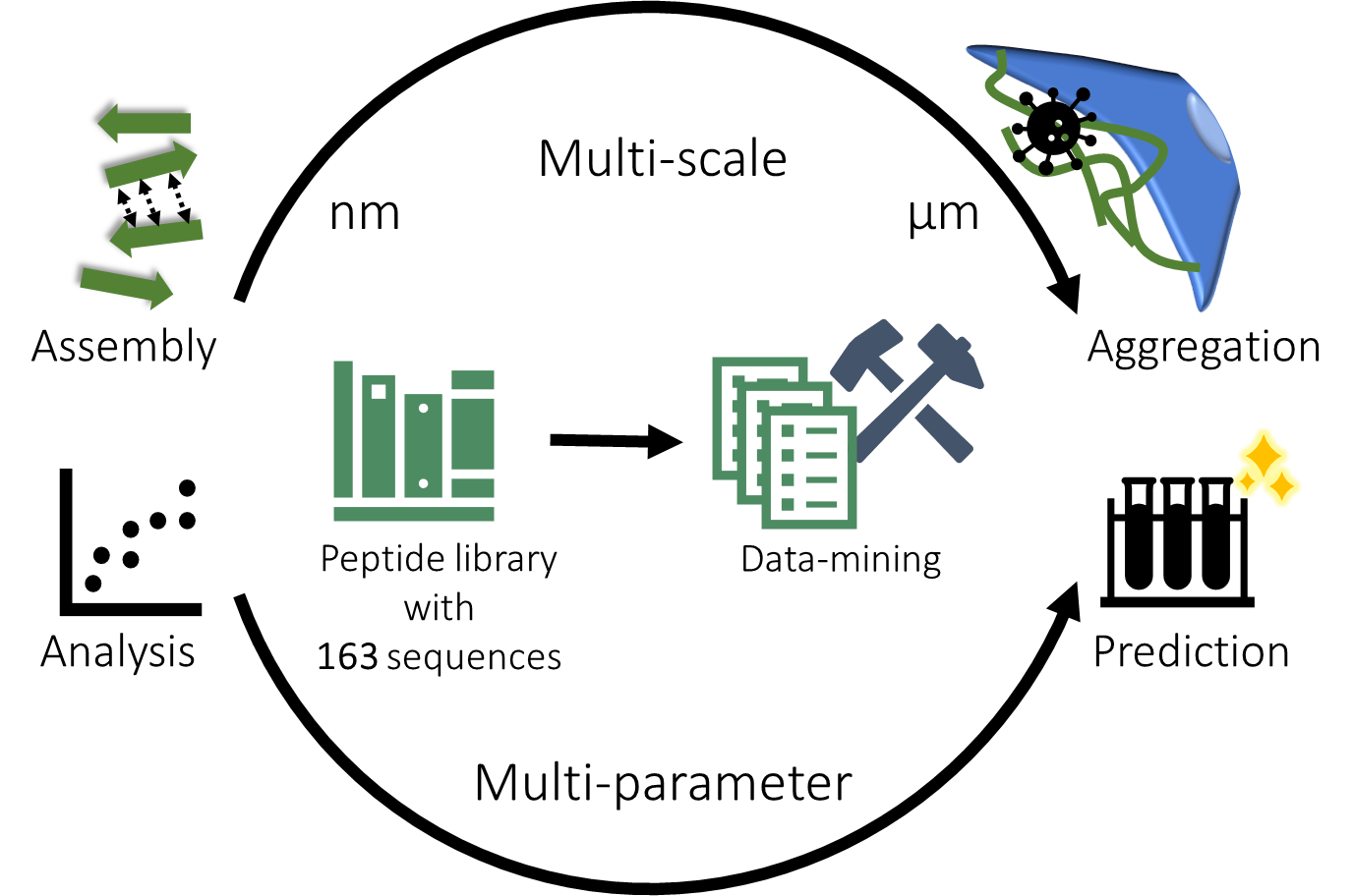 A challenge in establishing a structure–property–activity relationship for self-assembling peptides lies in the fact that the relevant properties span multiple length scales. Therefore, analysis methods that determine properties at various dimensions are required to investigate their intricate relationships systematically. We employed data-mining with regression models with the aim to simplify interdependent properties. This approach was chosen due to its ability to reveal underlying principles and multi-parameter patterns within a database.