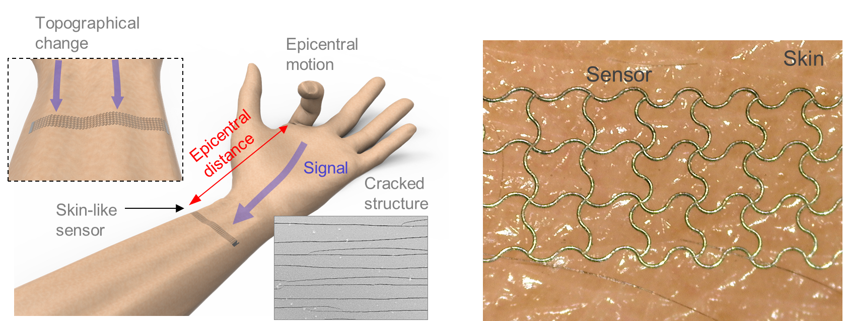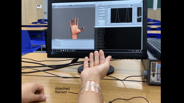We attached a single sensor above the wrist to capture the finger motions. As the same way detecting the earthquake, the sensor is placed at an epicentral distance (above the wrist) and decodes the hidden movements beneath the converged signal. By the aid of the neural network, a single sensor on the wrist successfully decoded the five finger movements. Surprisingly, the same concept can be expandable to other body parts such as identifying gait motions on pelvis and keyboard typing identification with only a single sensor! (check out the supplementary data in our paper) We anticipate that this sensory system can track the motion of our entire body with minimum amount of sensory network. The new device would facilitate the in-direct remote measurement of human motions and also applicable to soft robotics.
