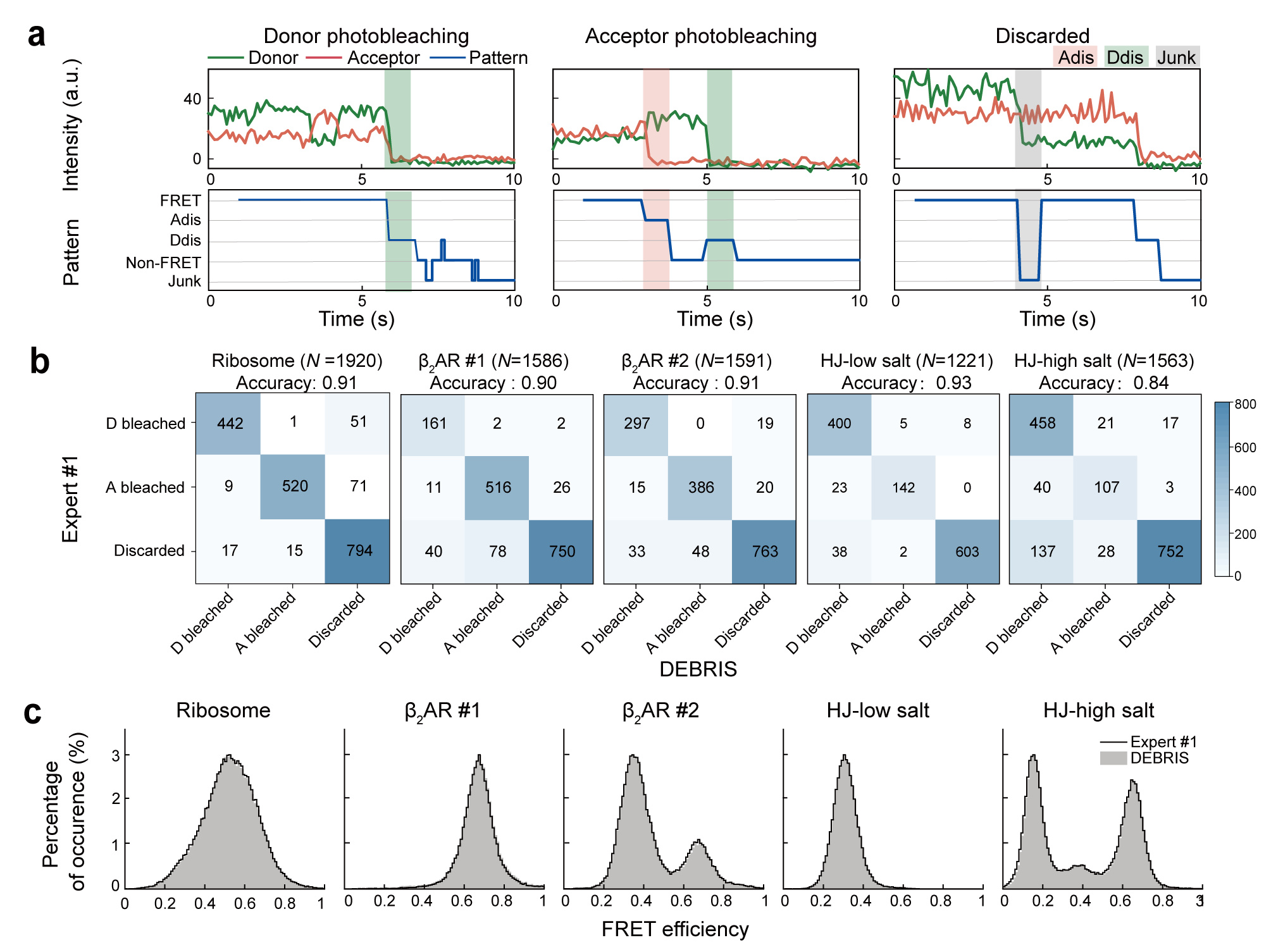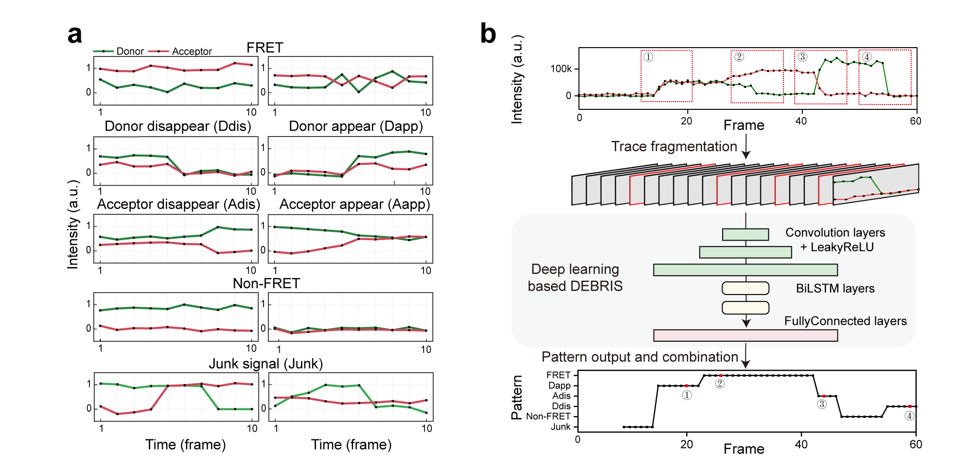 By accurately identifying local features of single-molecule fluorescence traces and allowing flexible adjustment of the classification criteria according to the experimental design, DEBRIS achieves accurate identification of steady and dynamic single-molecule fluorescence signals under two-color and one-color experimental conditions without modifying the neural network structure. This innovative approach provides an efficient data analysis tool for the application of single-molecule fluorescence technology, thereby greatly expanding its potential in biophysical research.