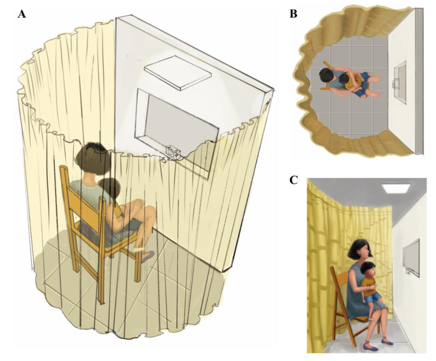 A. The standardized apparatus consisted of a recording stage, a curtain, a chair, a light (10 candelas/m2) and a video recorder. Both the stage and the curtain were used to eliminate external interferences; B. The video recorder was embedded in the middle of the stage with 1-meter ground height. The chair was fixed at a position of 0.55 meter facing the stage, to ensure that all the infants’ actions can be fully recorded; C. For each standardized procedure, the guardian sat in the chair, holding the infant facing the stage. Each infant was given a few minutes to adapt to the new surroundings and to be calm before recording. No hints or simulations were permitted during the process. The recording process lasted for more than 5minutes to ensure that the behavioral phenotypes could be completely and repetitively recorded.