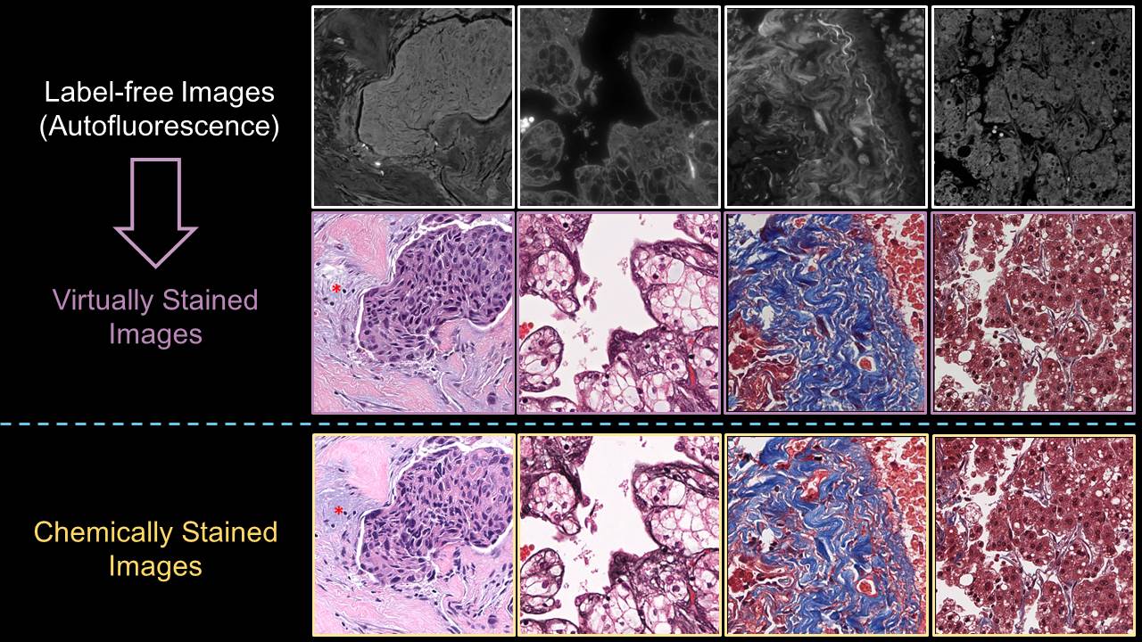 Looking forward, we envision that this AI-based virtual staining technology, after going through further development and validation with large-scale clinical studies, will create a paradigm shift in the field of histopathology. In addition to replacing the standard workflow in histopathology labs with a much simpler, faster and more cost-effective alternative, it will also lead to new capabilities that are nearly impossible to achieve with today’s standard methods such as the simultaneous virtual staining of the same sectioned tissue with multiple types of stains, while also preserving the unstained sample for further molecular analysis, if needed. In addition to these exciting opportunities enabled by our method, deep learning-based virtual staining also eliminates the need for a well-trained histotechnologist, helping us with another bottleneck for running pathology services in resource-scarce countries, where the availability of expert medical personnel is often limited. This AI-based virtual staining technology can also be used in surgery rooms to rapidly assess tumor margins, providing highly-needed and critical guidance for surgeons during an operation.