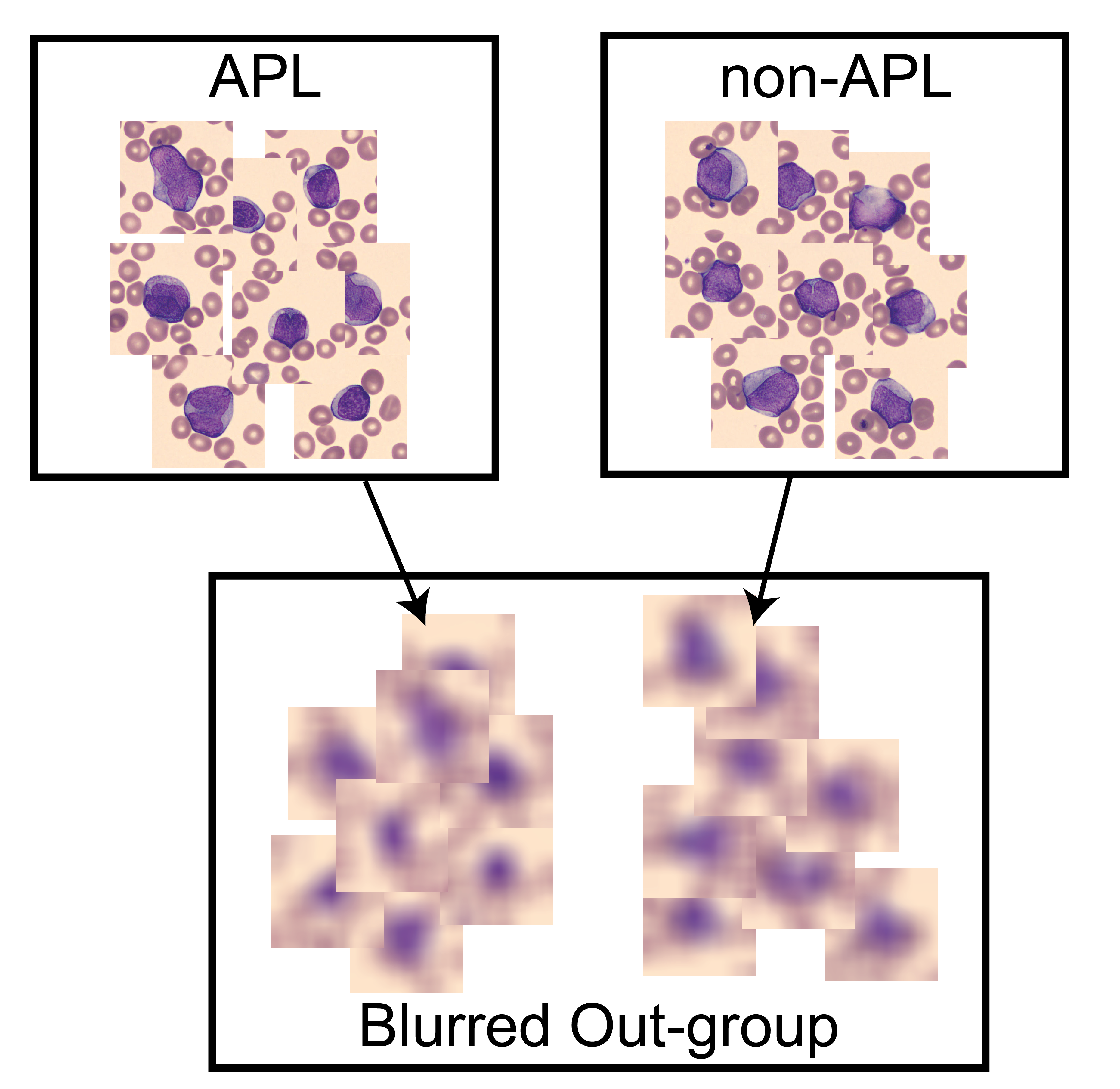 Figure 4. Training strategy to remove batch effects from staining. In order to encourage the model to learn morphological features (over confounders from staining artifacts) from the imaging data, we created a third out-group for training where the original APL/AML images were blurred. The model is then trained to distinguish samples from these three groups (APL, non-APL, and the blurred out-group).