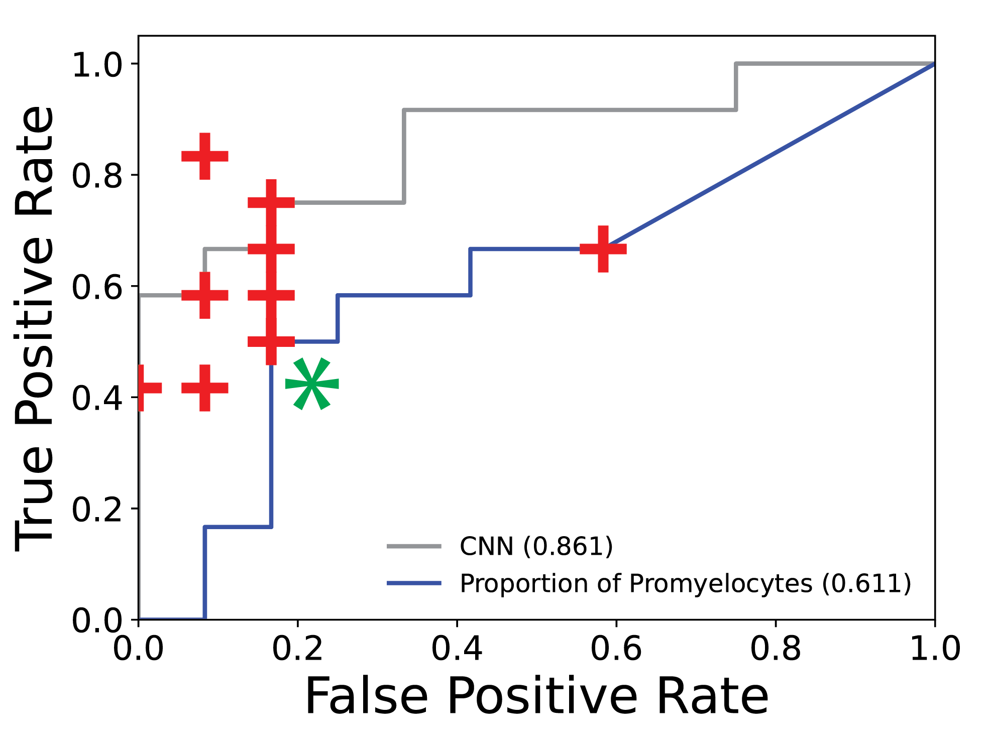 While our manuscript touches upon multiple deep learning models trained with different cell types from the peripheral smear, we found the optimal model was a multiple-instance deep learning model that could ingest all the cells from the peripheral smear and output the probability of the patient having APL (Fig. 1). One can imagine this model as being able to look at all the cells from a peripheral smear and learn to focus its attention on the cells that carry the predictive signature of APL. The model can not only tell you whether the given patient has APL but it can also highlight for the physician the most predictive cells, the ones that carry the strongest APL morphological signature.
